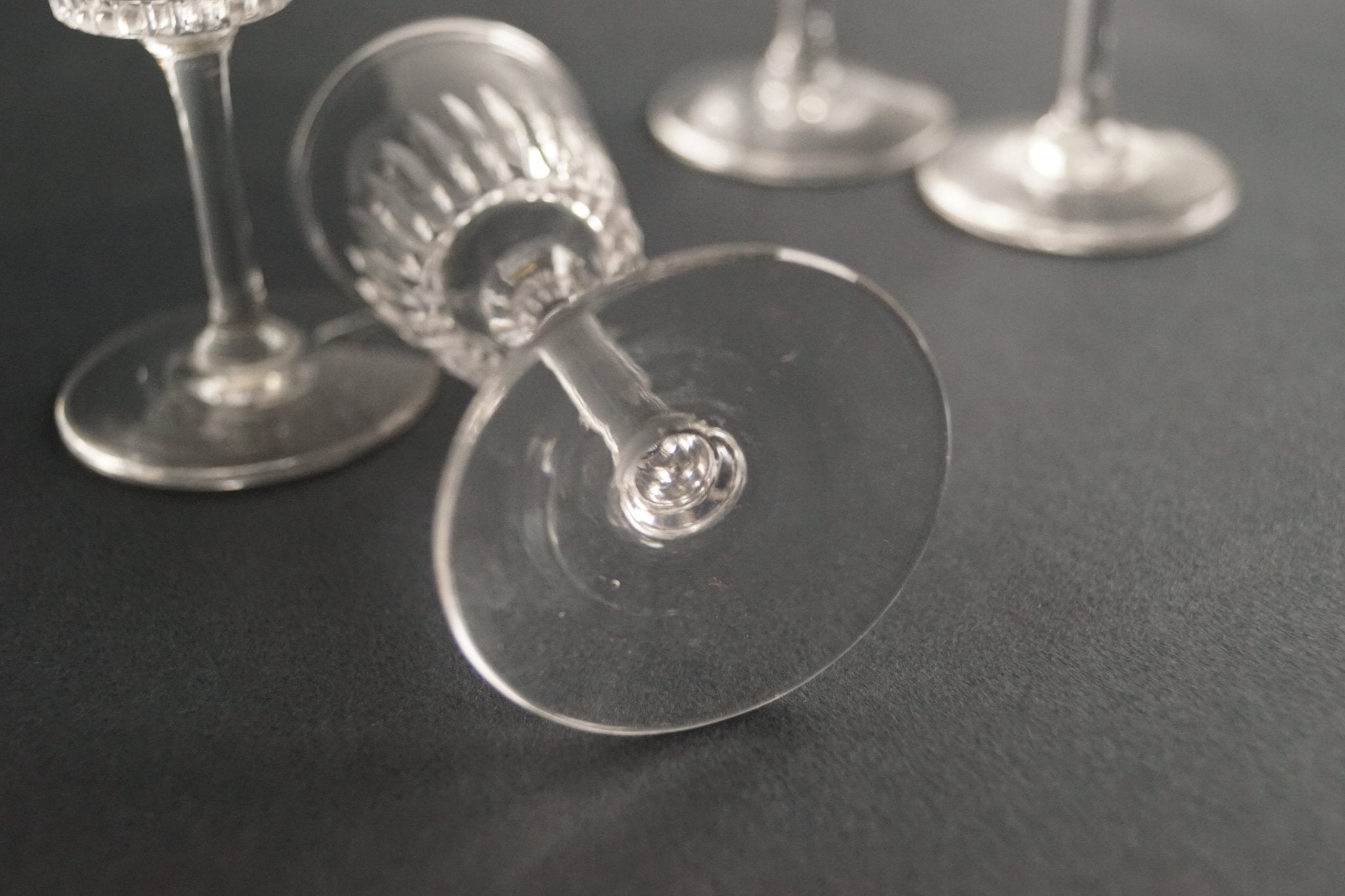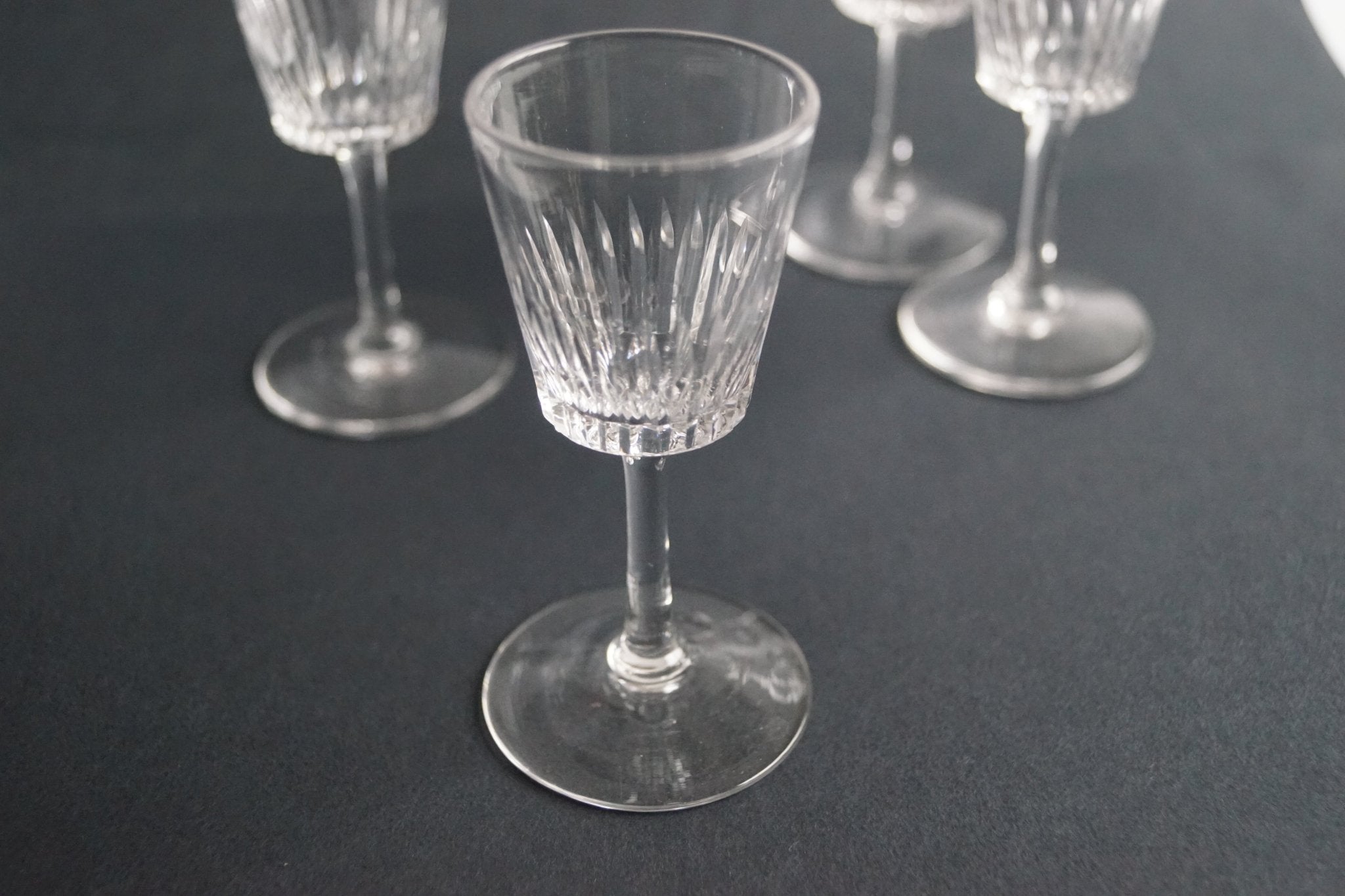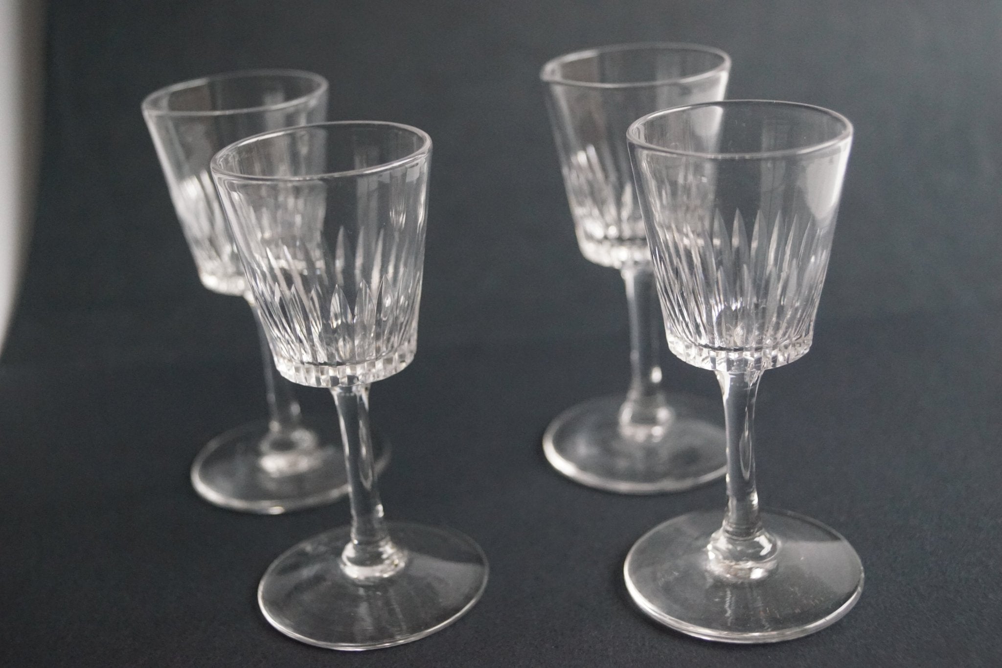 Unieke set van vier elegante antieke Franse likeurglaasjes met een geribte kelk op ronde voet.