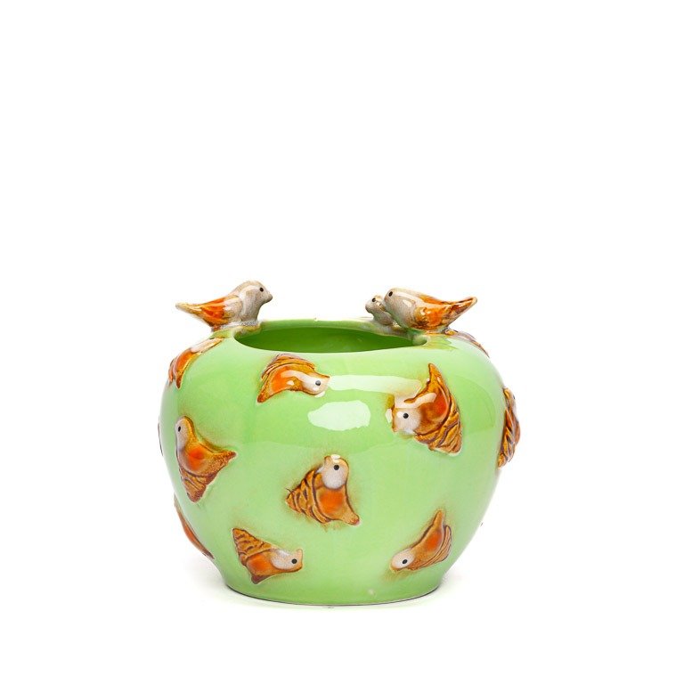 Handbeschilderd en geglazuurde vaas met bijen, op een geel fond.