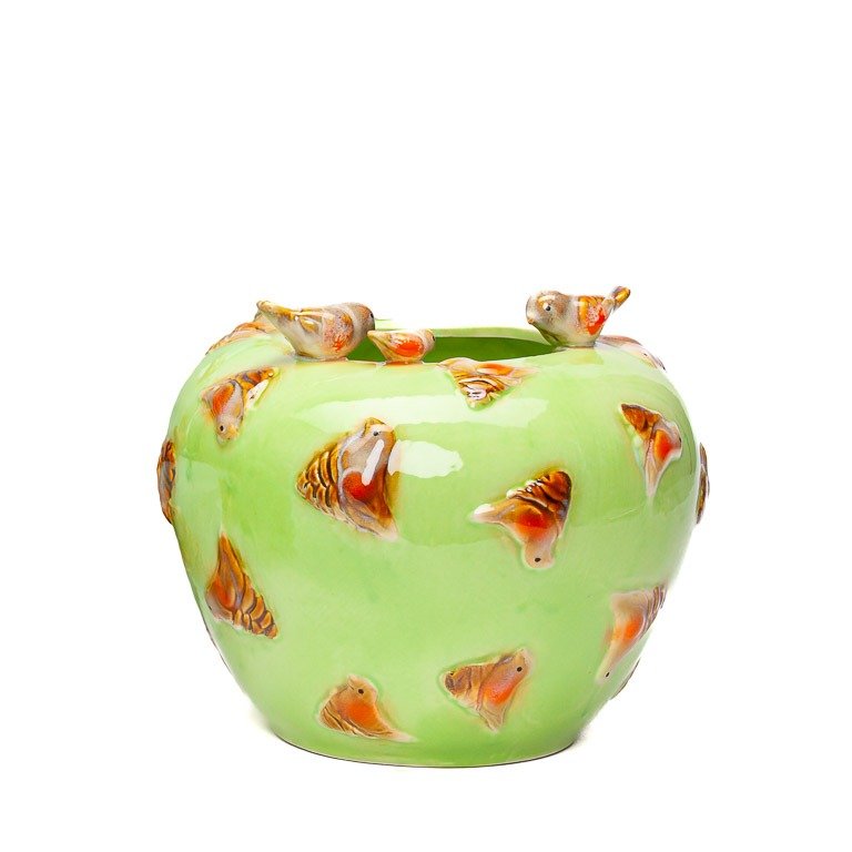 Handbeschilderd en geglazuurde vaas met bijen, op een geel fond.