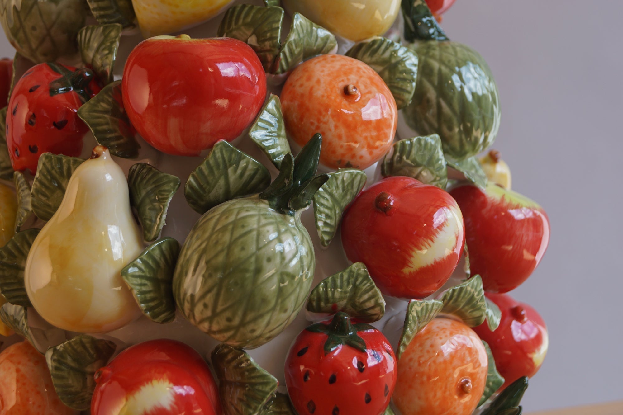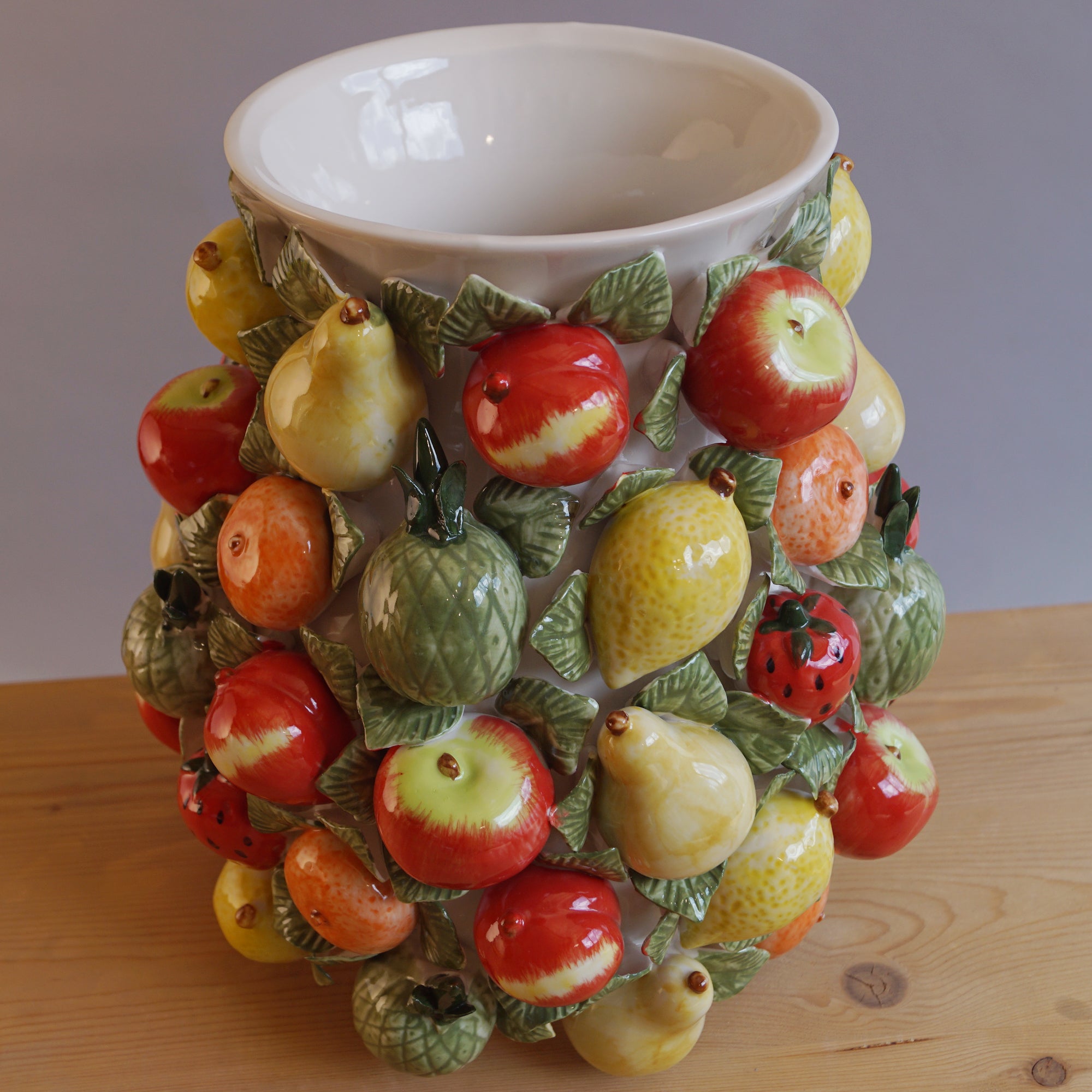 Vrolijke vaas met driedimensionaal fruit en blaadjes in fijn porselein.
