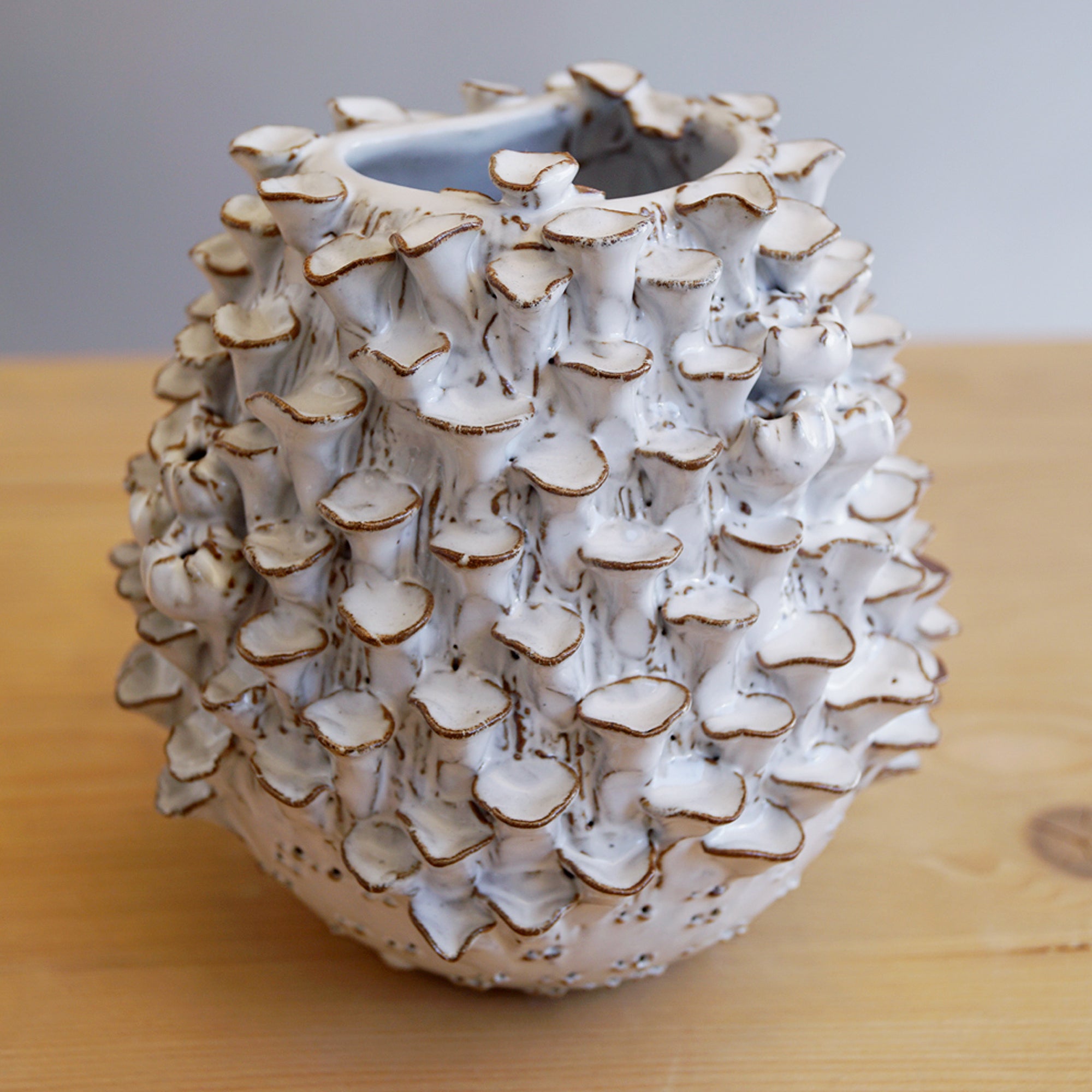 Hardgebakken vaasjes in steengoed of gres, wit geglazuurd en handgevormd.
