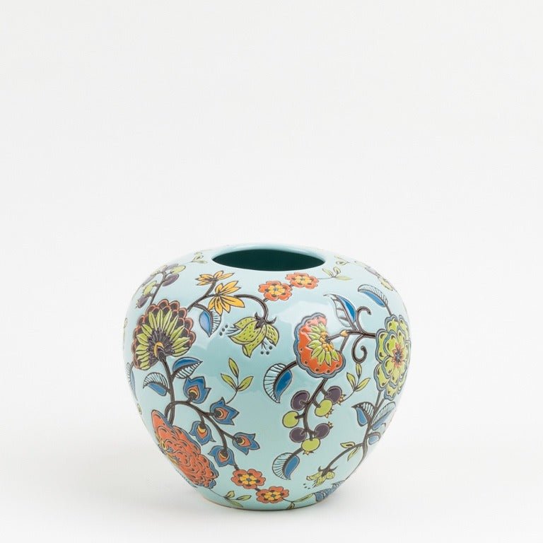 Decoratieve vazen met een decor van elegante bloemranken. Op 1200 graden gebakken, geglazuurde keramiek. Er zijn verschillende uitvoeringen leverbaar.