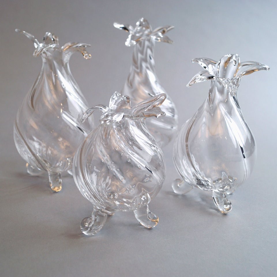 Deze gedraaide glazen Padua bloemenvaasjes op hun sierlijke pootjes lijken met elkaar te dansen, de gedraaide vorm van het glas suggereert beweging. Wanneer u er bloemen in zet zullen ze worden meegenomen in deze levendige dans. Een klein prijsje, een dankbaar cadeau. Afname per set.