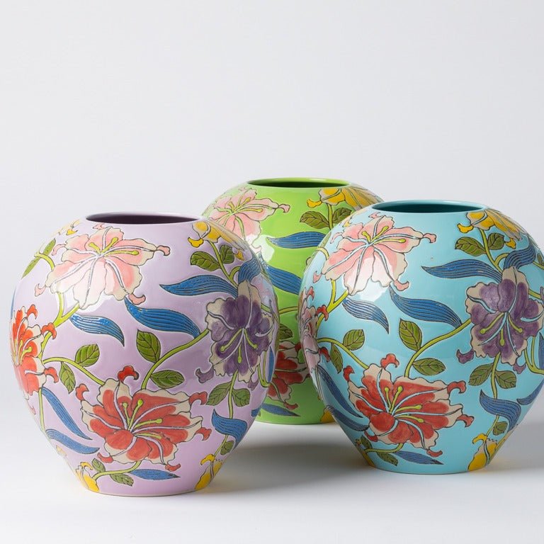 Decoratieve en kleurrijke vaas met een decoratie van bloemen in geglazuurd aardewerk.