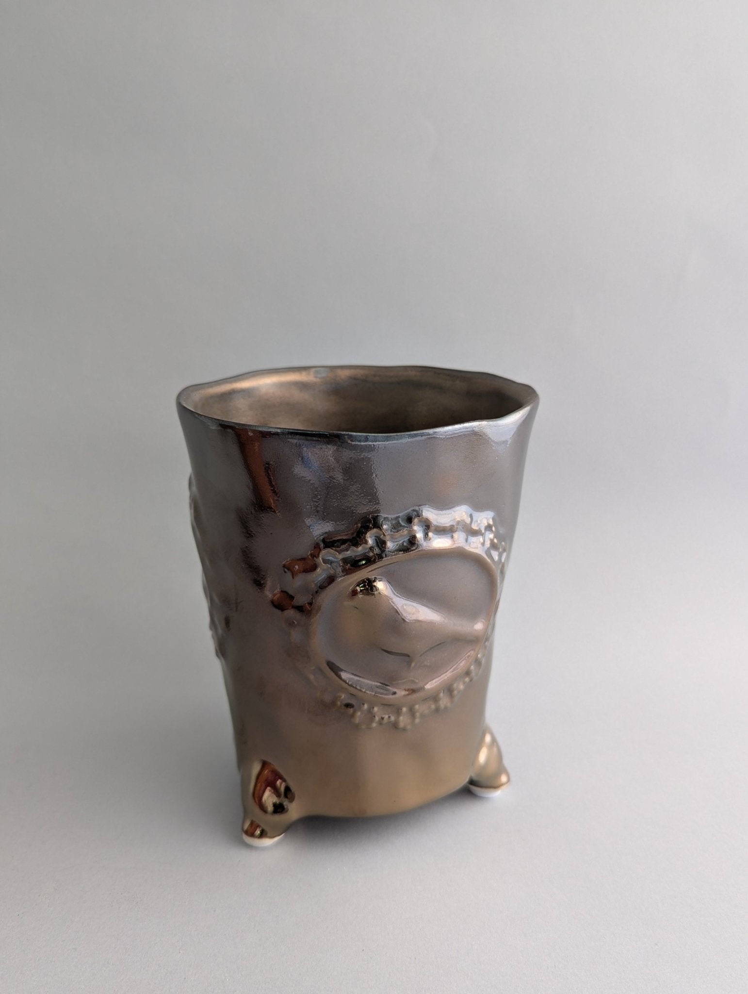 Deze potjes met hun aantrekkelijke kleuren zijn geplaatst op een drietal pootjes. Ze kunnen worden gebruikt als plantenpot of als sfeerlicht. In het laatste geval fonkelt het bronsglazuur aan de binnenzijde van de pot.