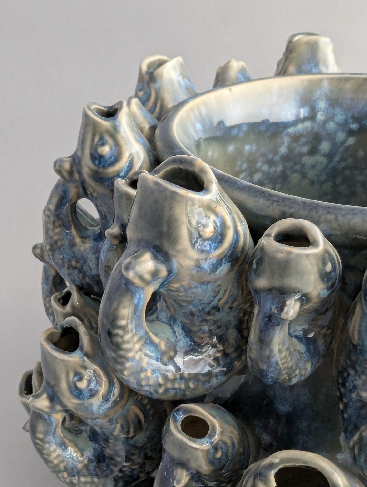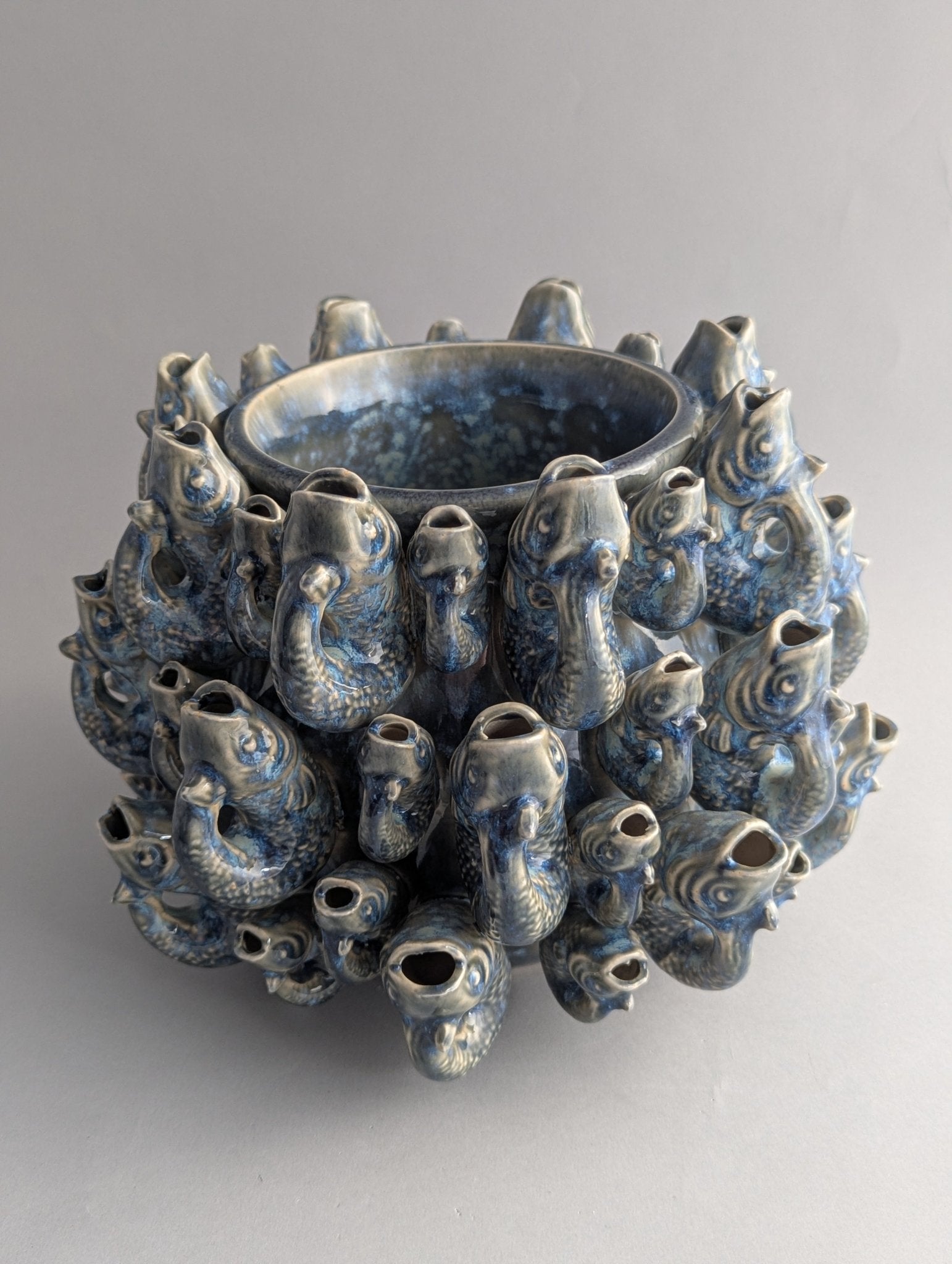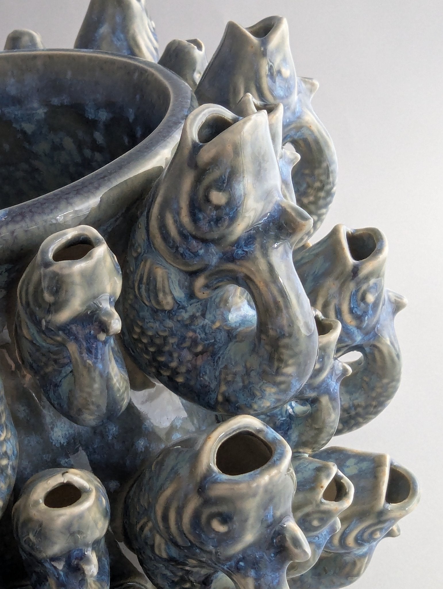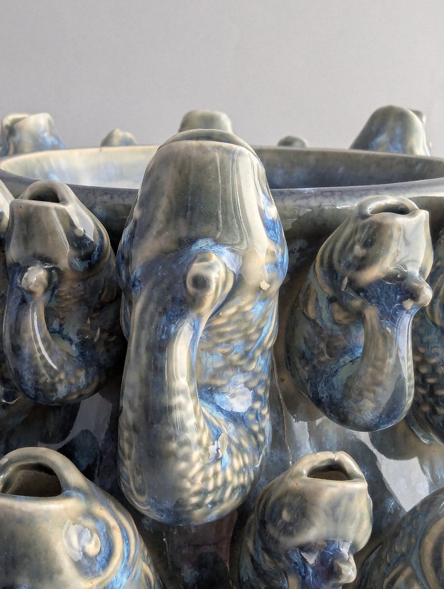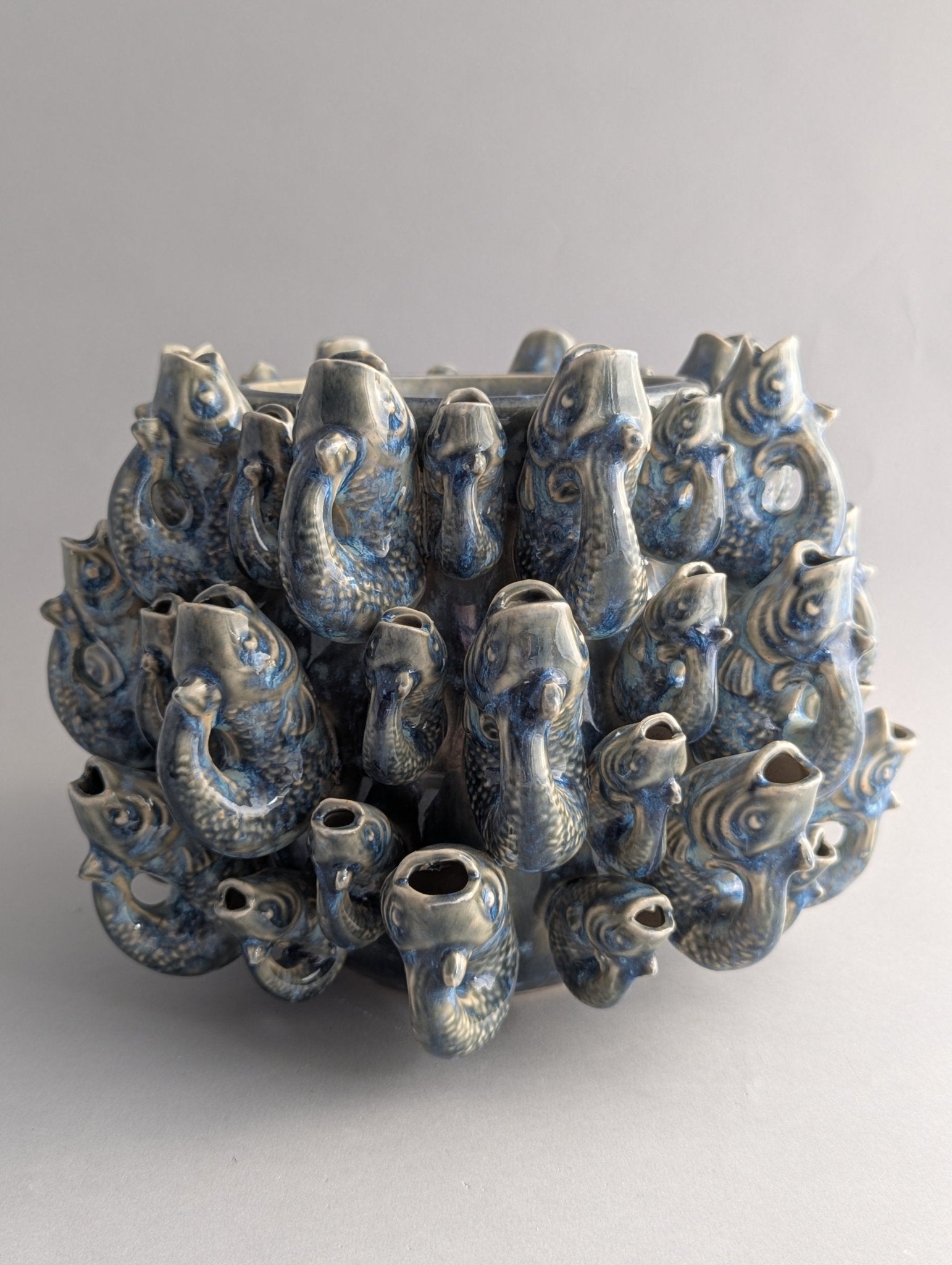 Handgevormde keramische vaas met gedetailleerde vissen die uit het water lijken te springen. De vaas is gemaakt van fijn geglazuurd aardewerk.