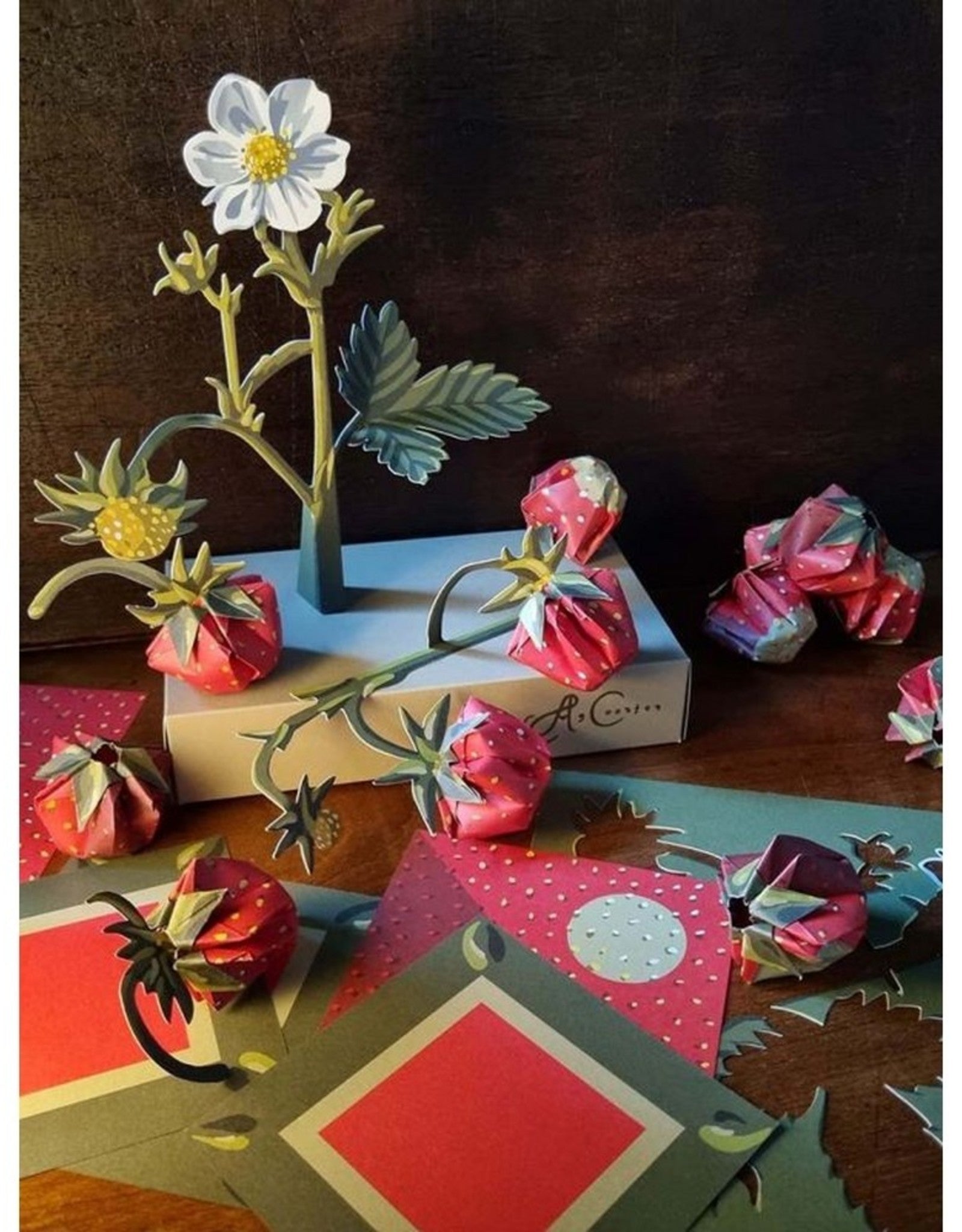 Vouw je eigen papieren stilleven met aardbeien.