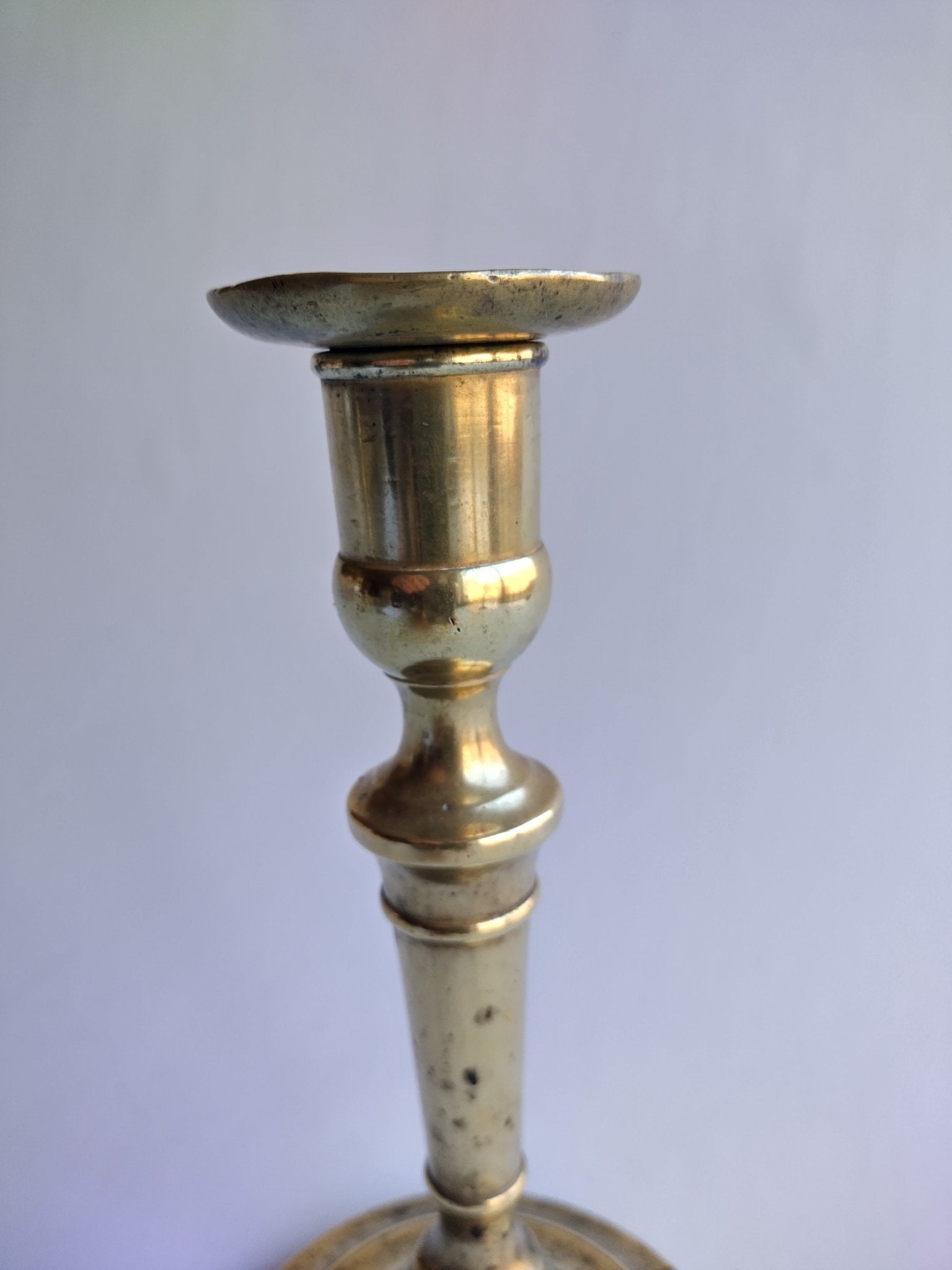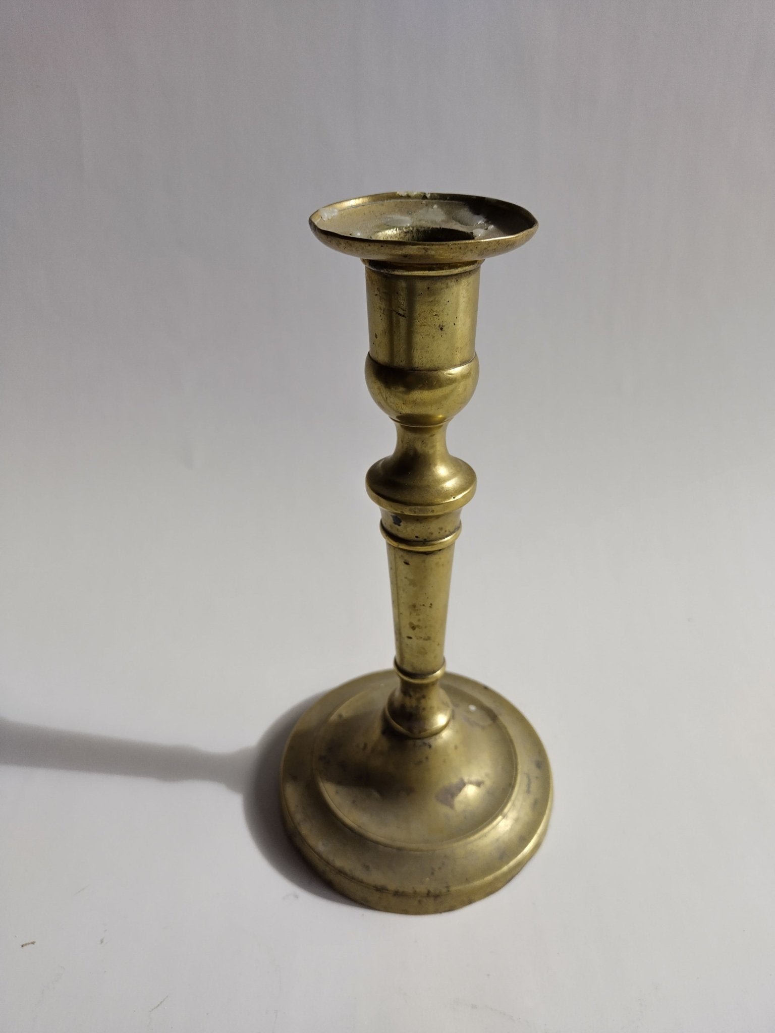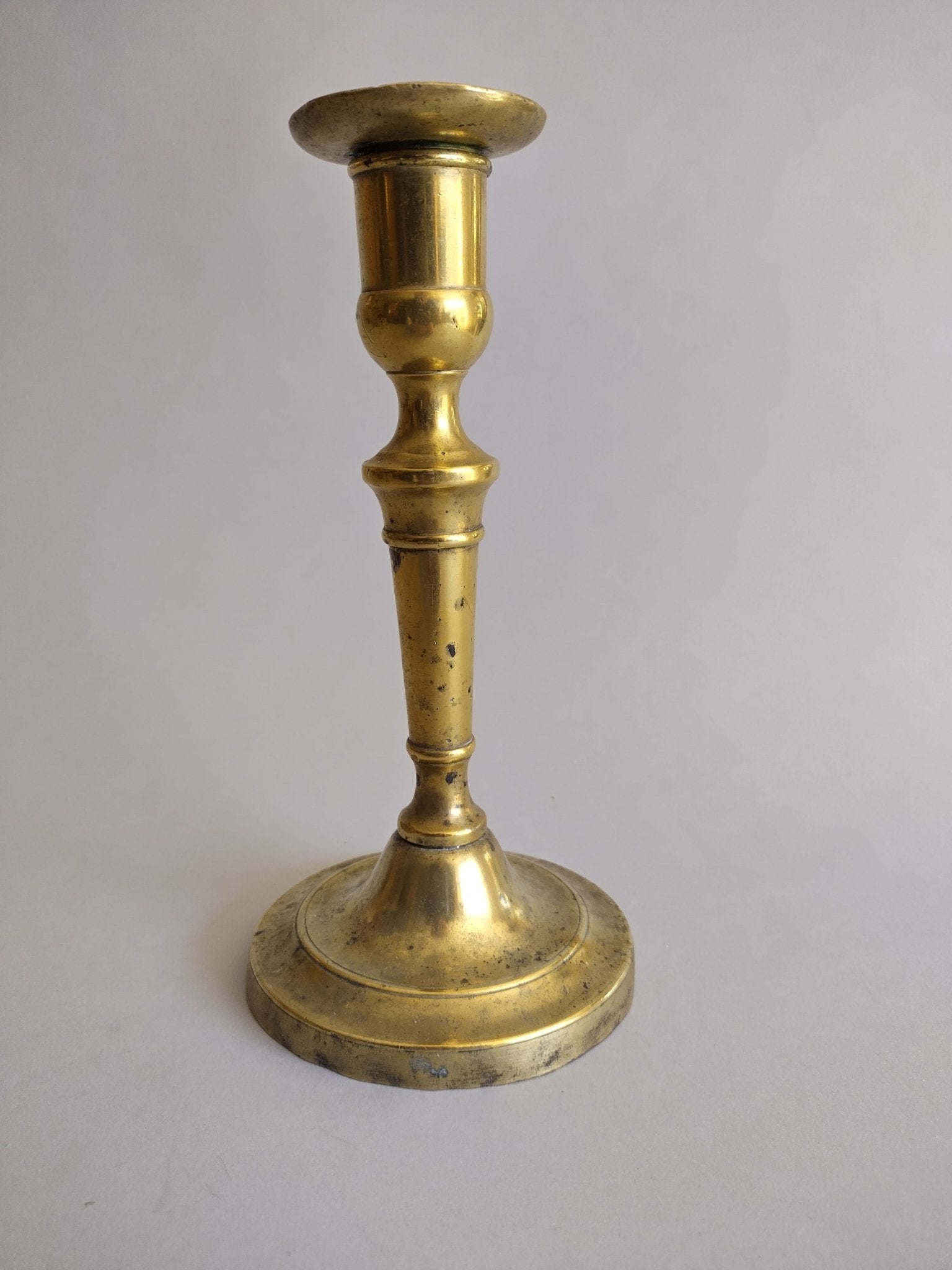 Messing kandelaar, met een rechte kaarsenhouder met een ronding. De stam is conisch, op een ronde voet geplaatst. Vervaardigd in het midden van de 19e eeuw.