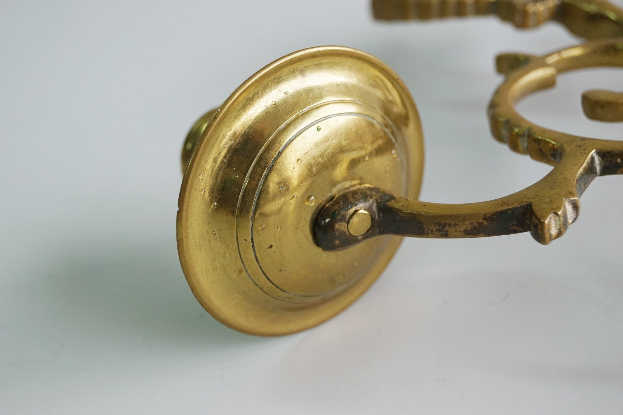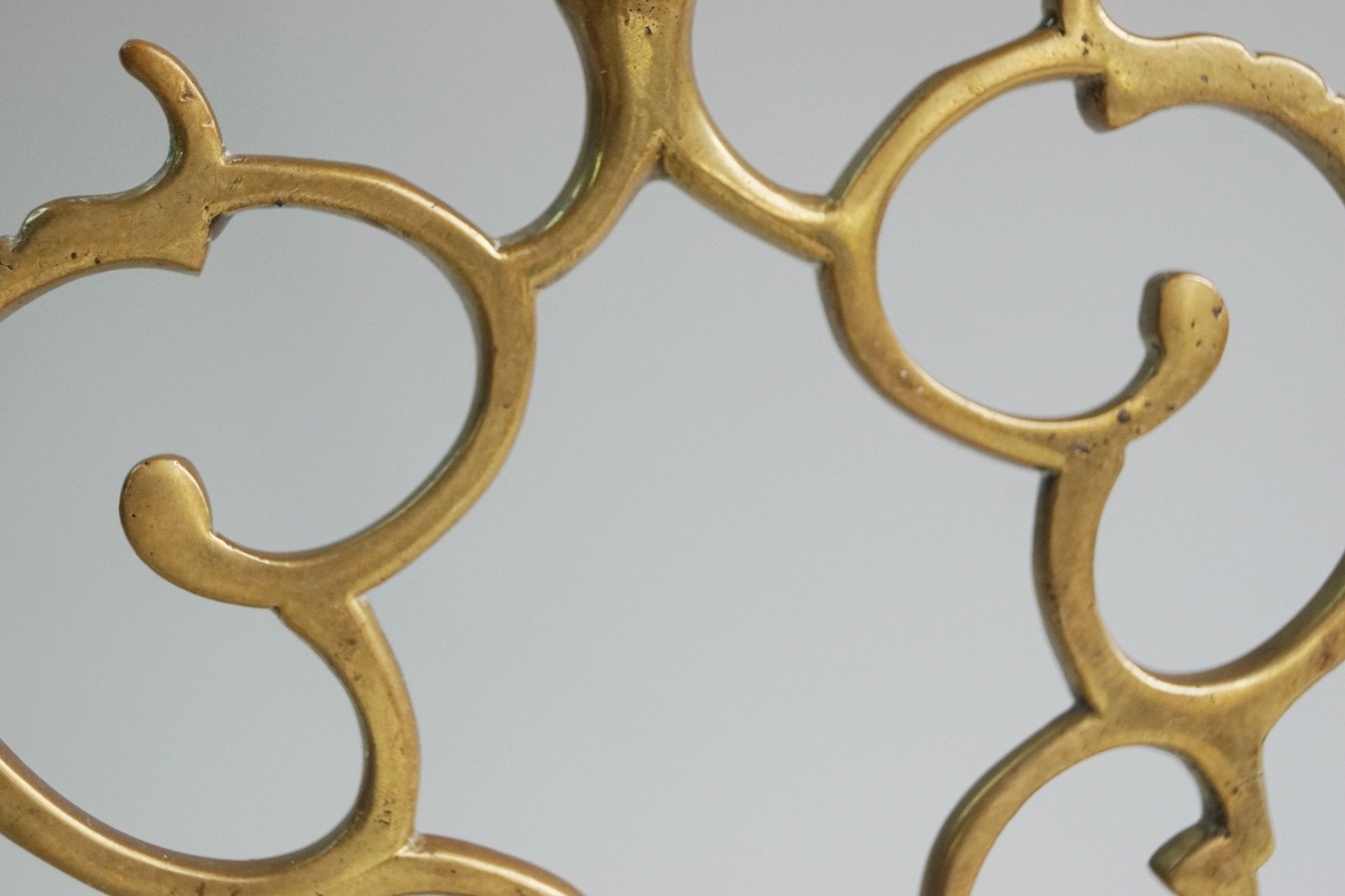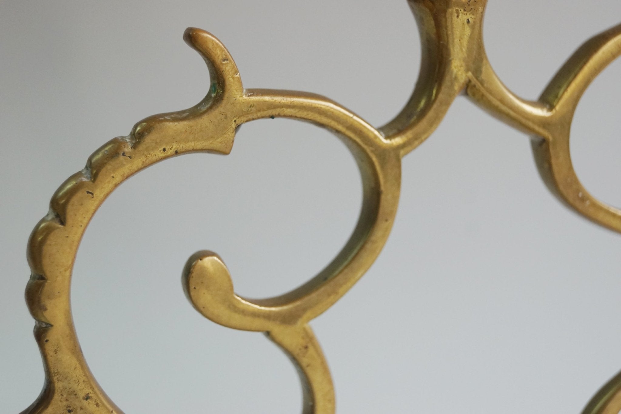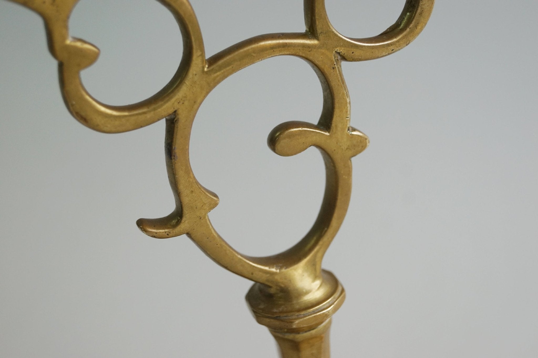 Deze sierlijk versierde kandelaar wordt bekroond door een dubbele adelaar, mogelijk een herinnering aan de Oostenrijks-Hongaarse dubbelmonarchie. De vorm, solide uitgevoerd, met de sierelementen in één vlak, is kenmerkend voor dit Midden-Europese type kandelaars.