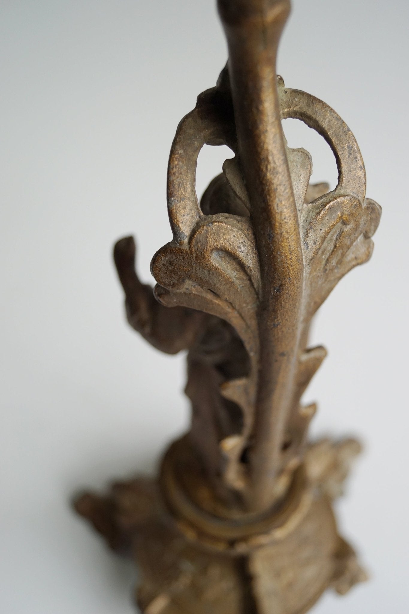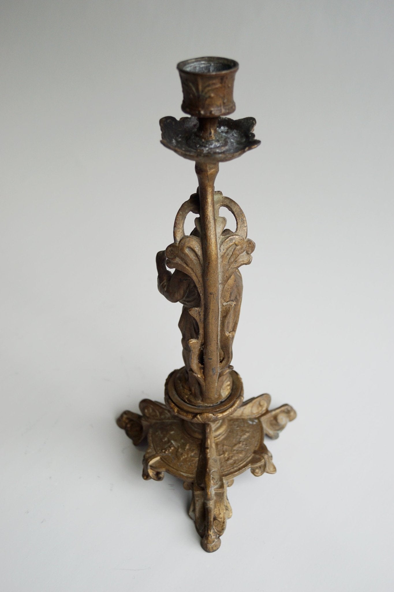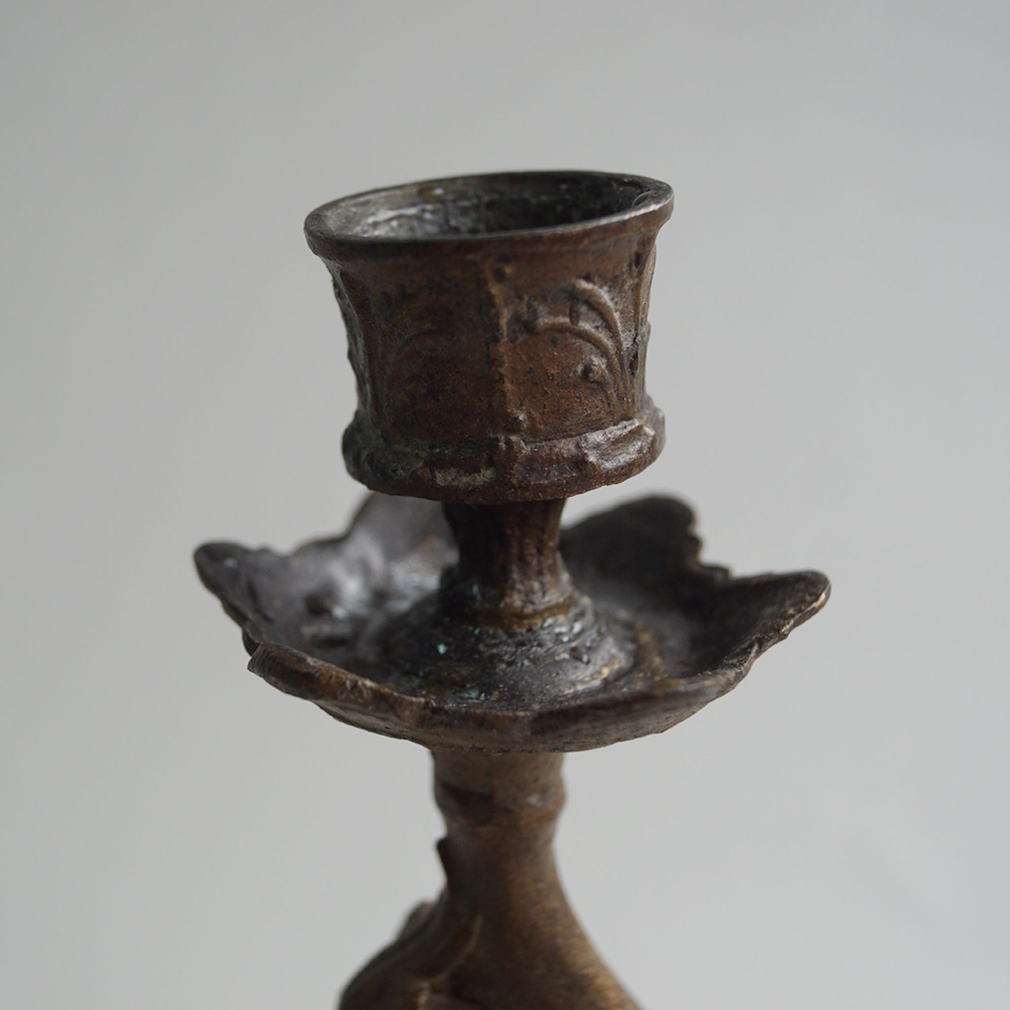 De kandelaar is gegoten in tombak, een legering van messing en zink, en goud gepatineerd. Aan de voet is aan één zijde een stukje van het centrale ornament afgebroken.