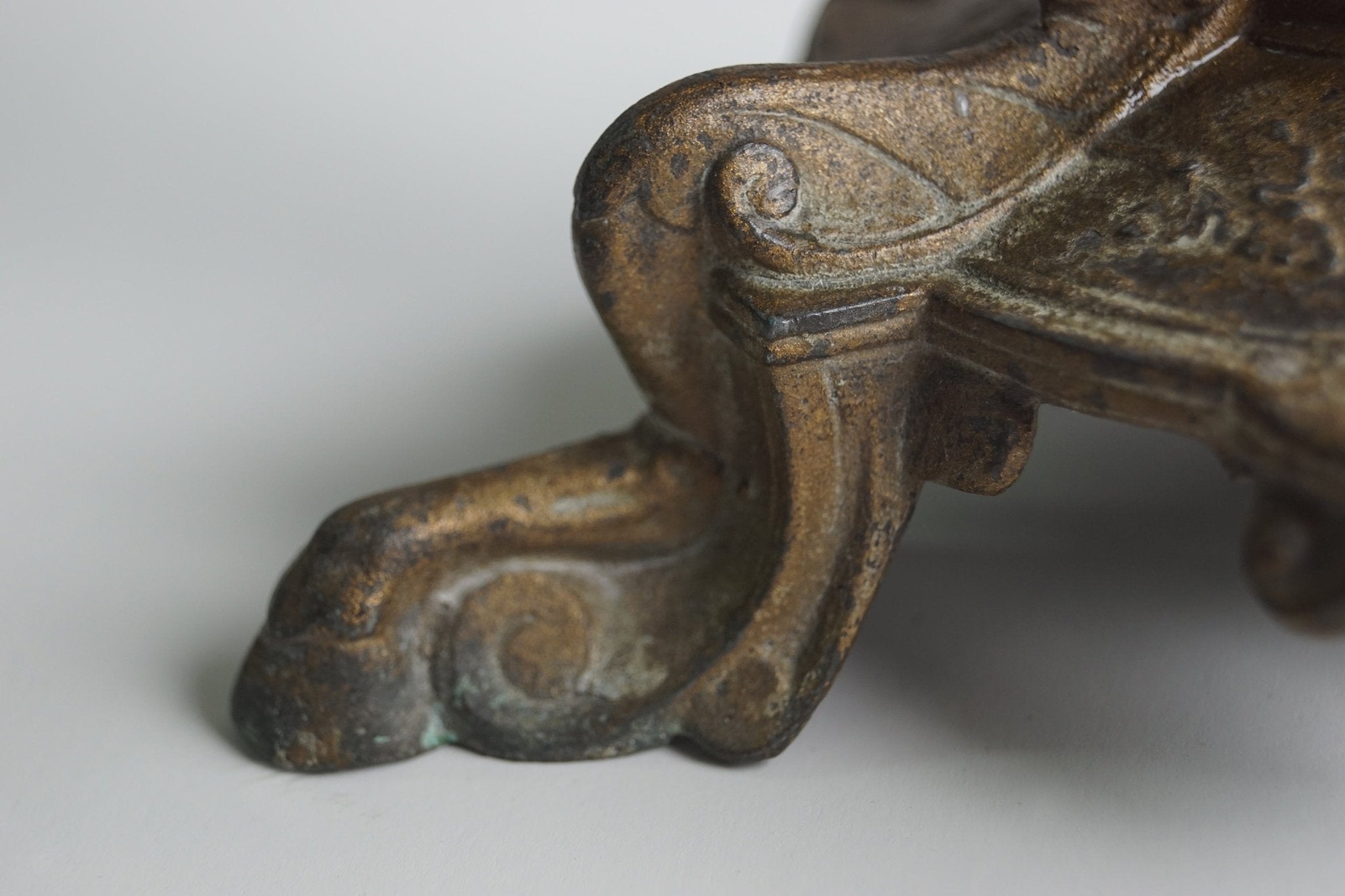 Merkwaardig genoeg staat deze religieuze kandelaar letterlijk op drie poten met hoeven, een decoratief element ontleend aan de heidense oudheid.