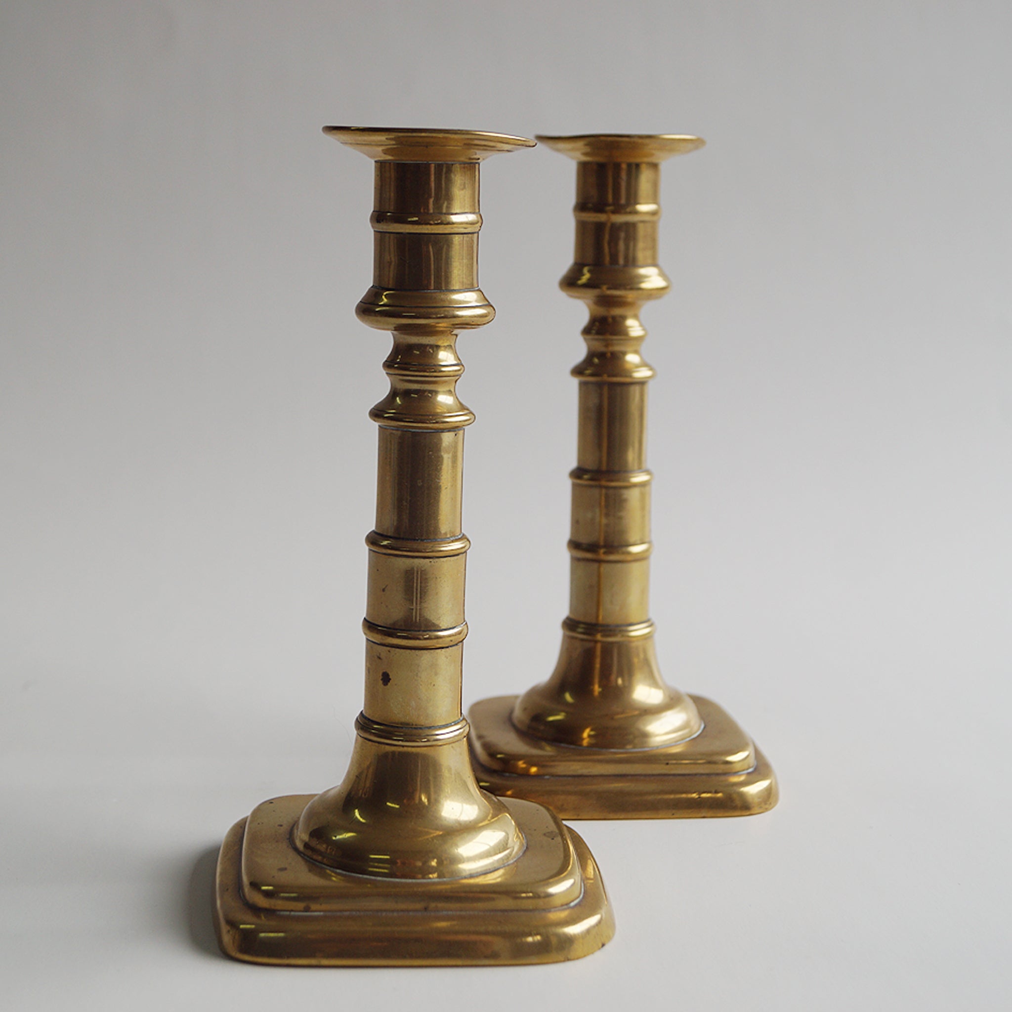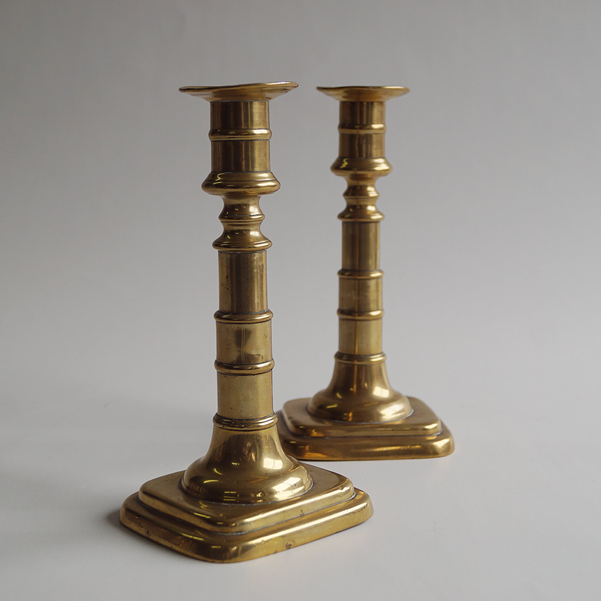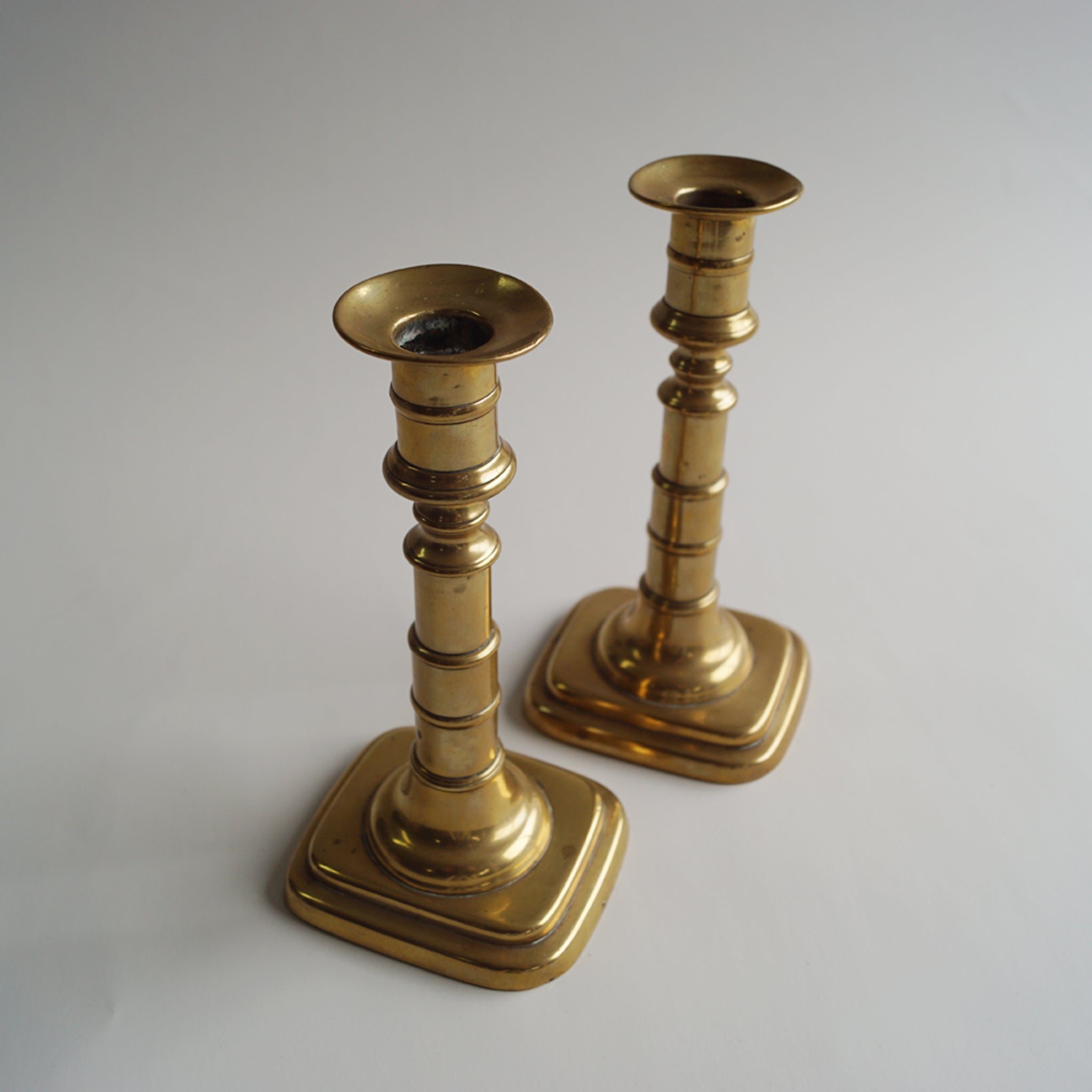 Een elegant paar Engelse vroeg Victoriaanse messing kandelaars met "pushers"