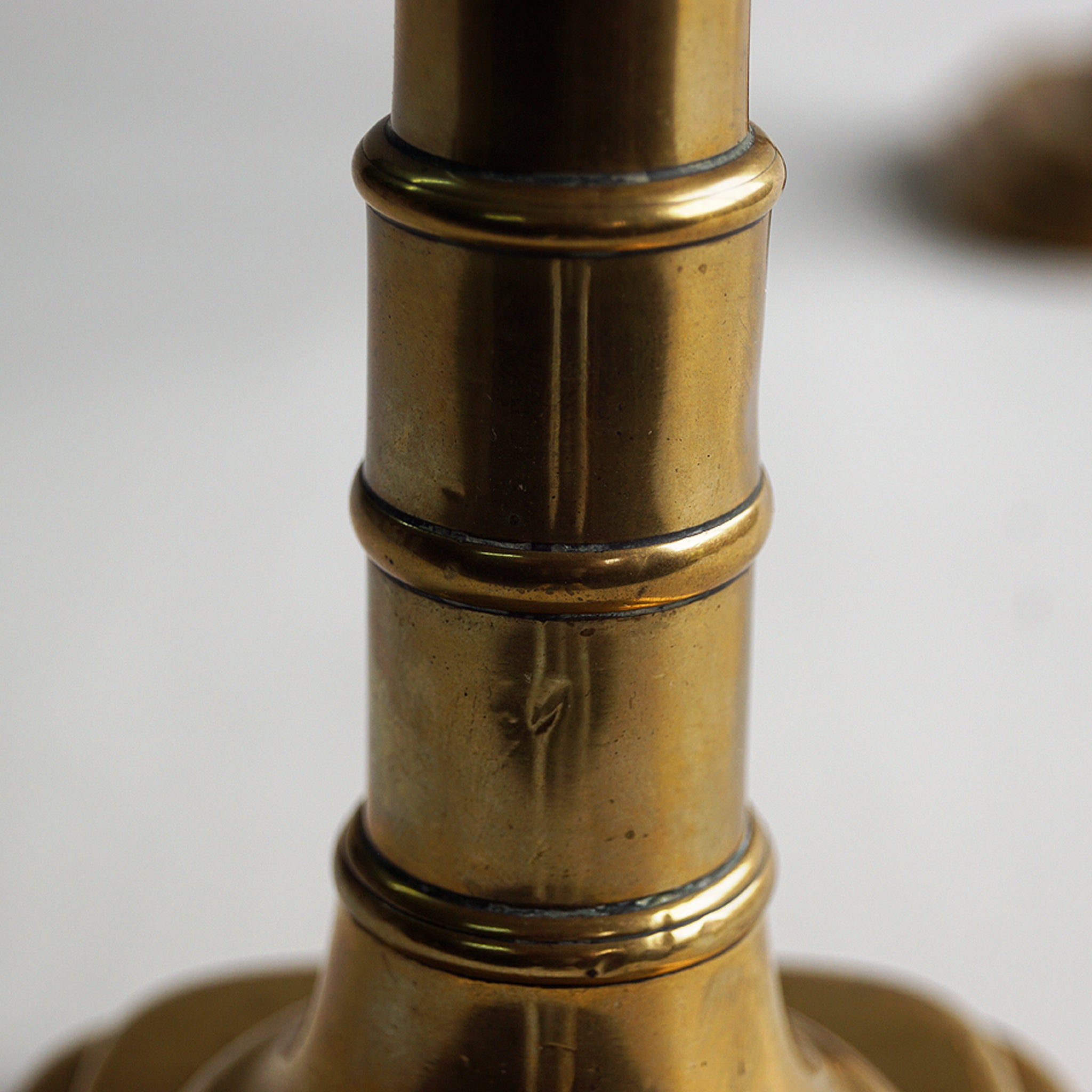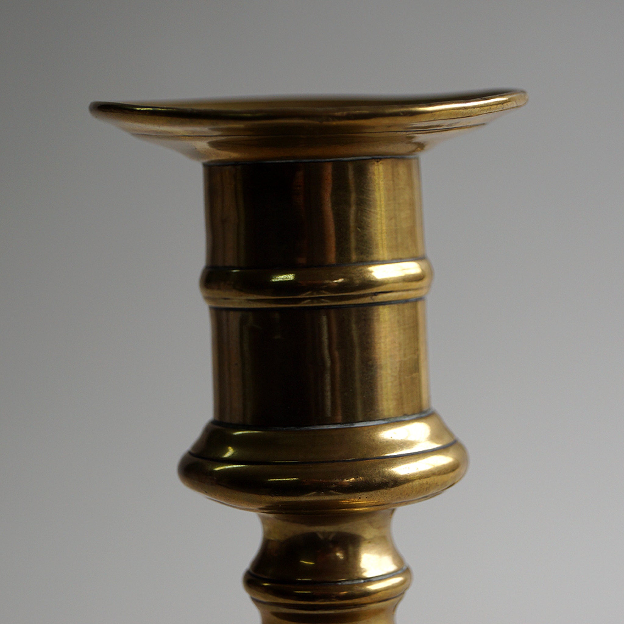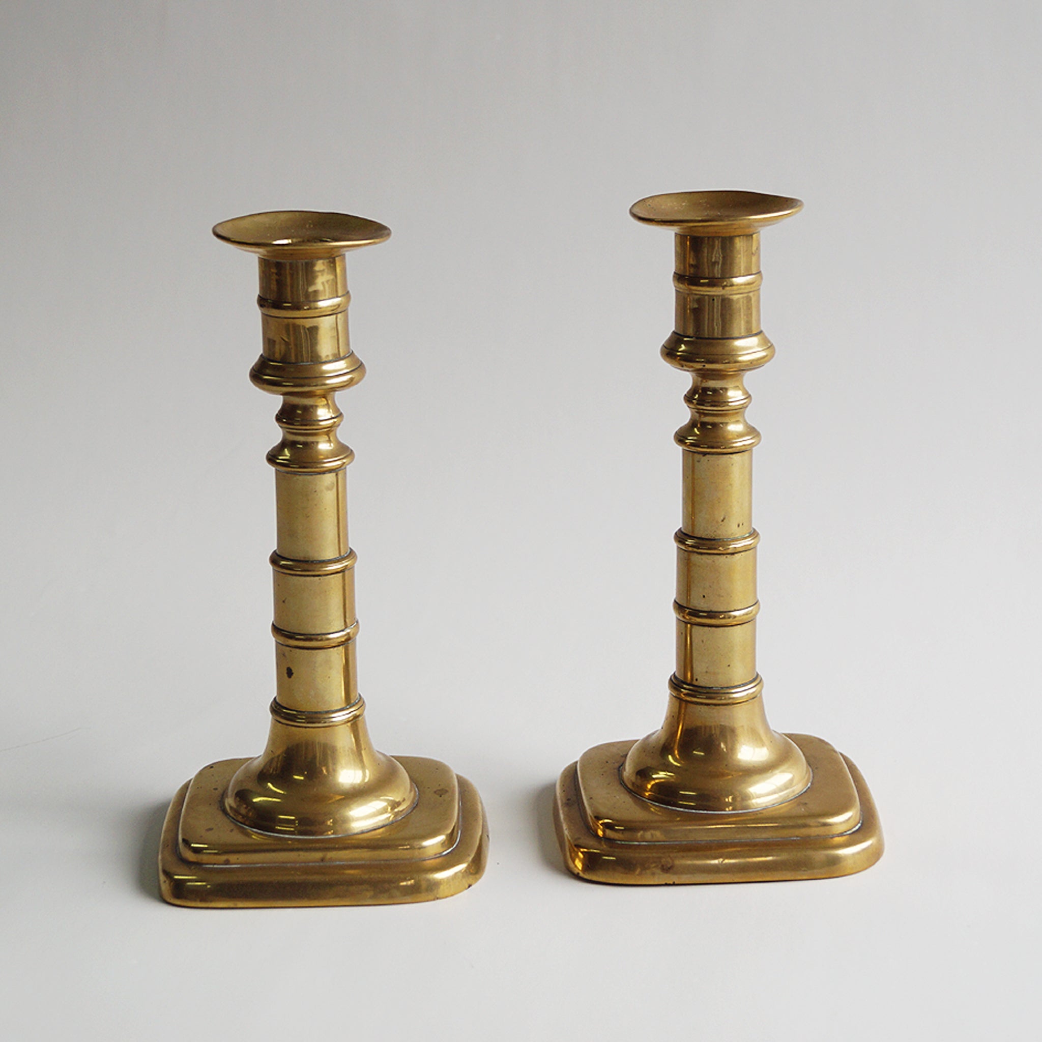 Een elegant paar Engelse vroeg Victoriaanse messing kandelaars met "pushers"