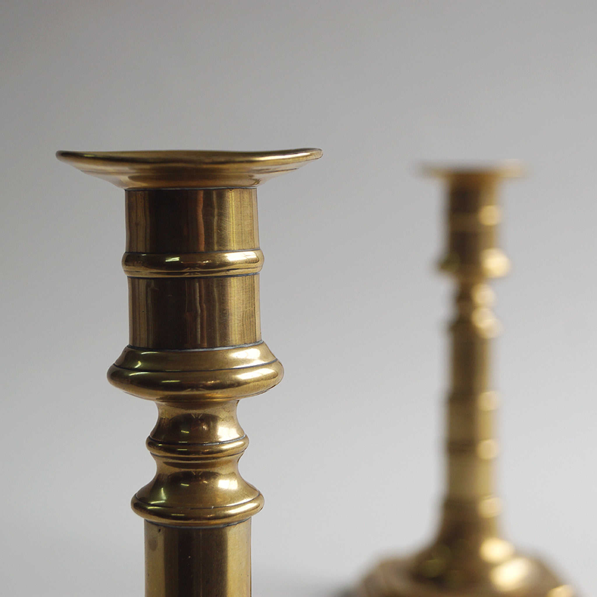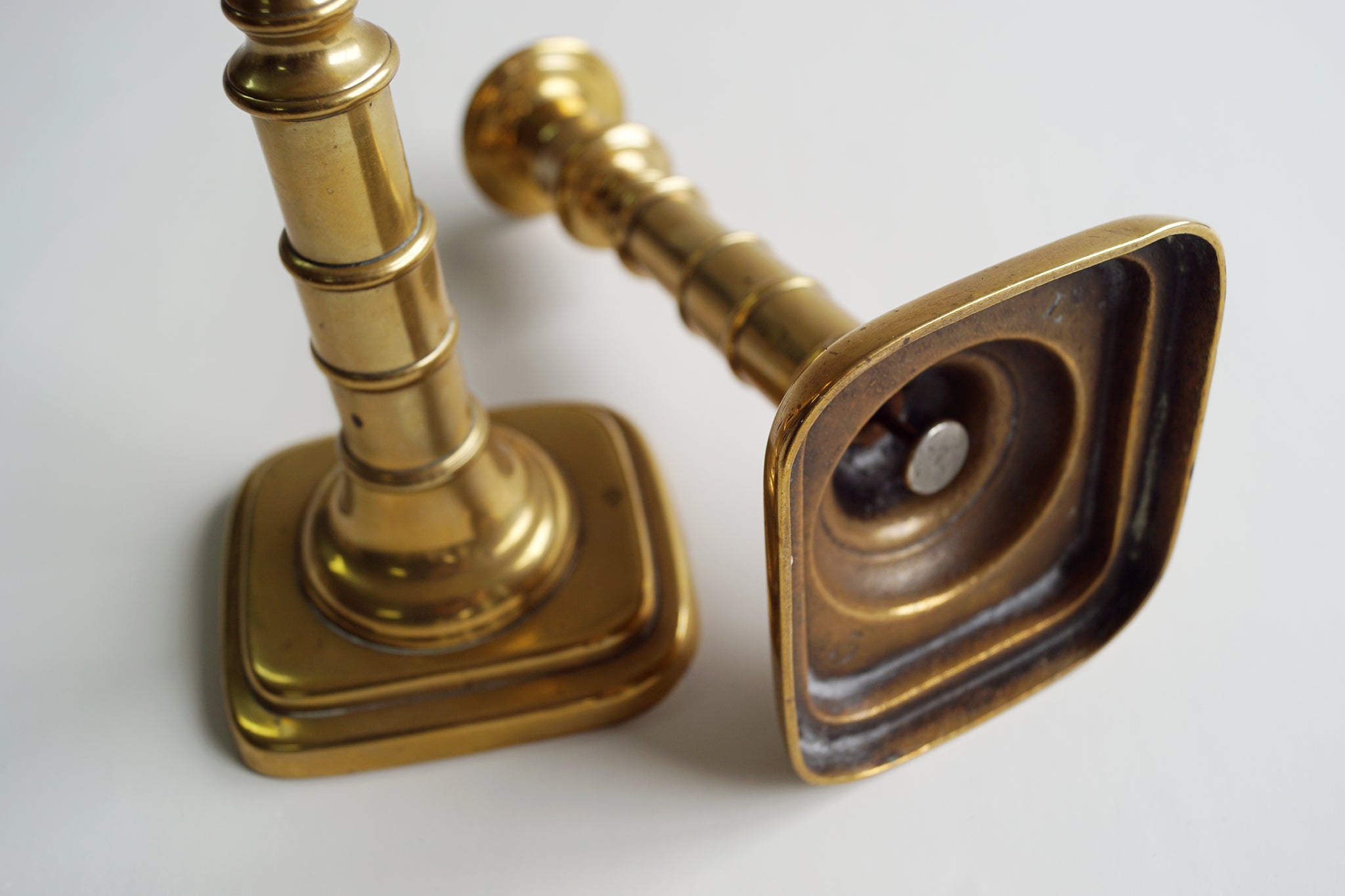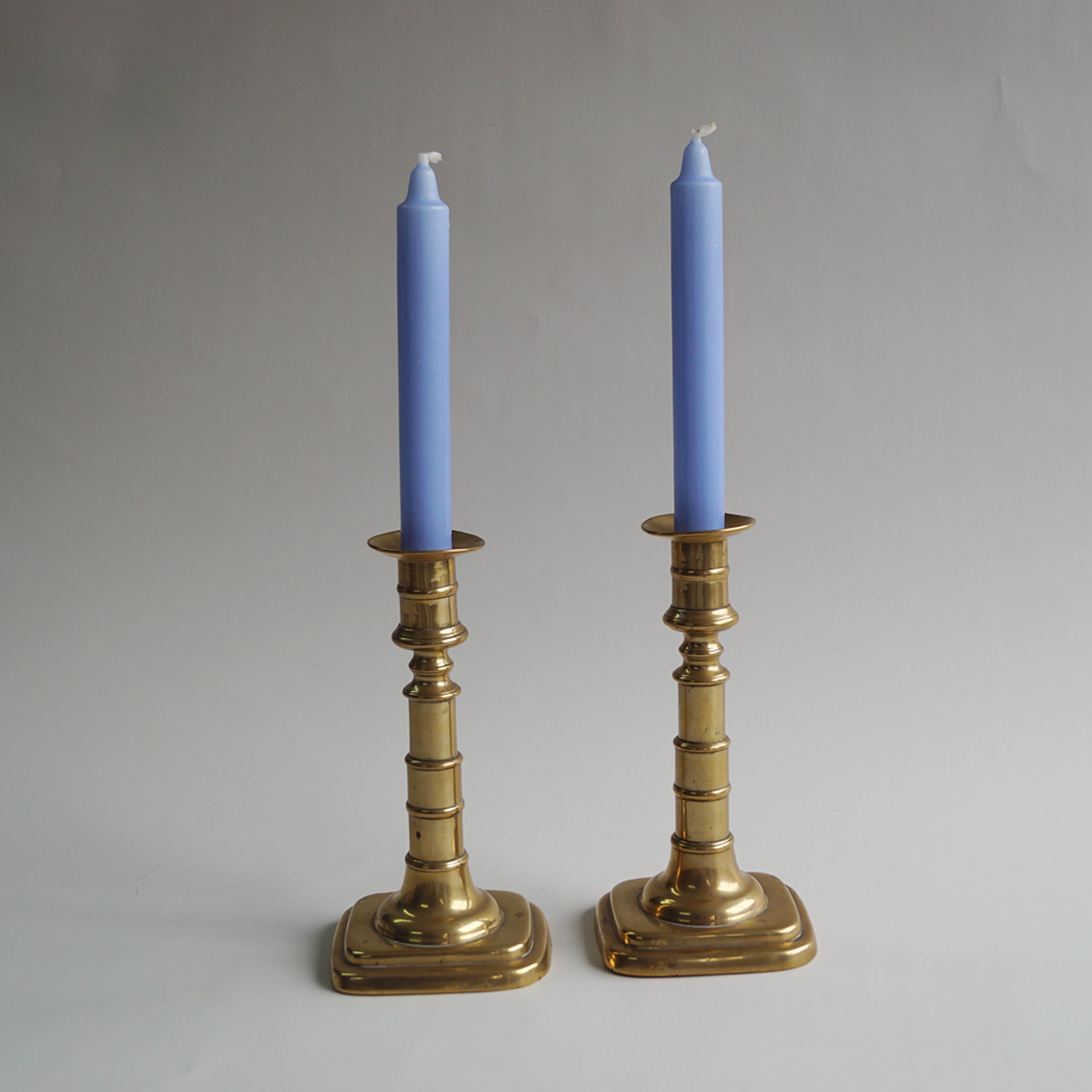 Het ingetogen ontwerp benadrukt de mooie, strakke proporties van de kenmerkende cilindrische vormen en geeft de kandelaars een zekere elegantie. De kandelaars hebben een rechthoekige voet met afgeronde hoeken - niet te breed voor op een smalle schoorsteenmantel - en zijn voorzien van duwers om kaarsstompen te verwijderen. Meestal - zoals ook in dit geval - werken deze niet meer.