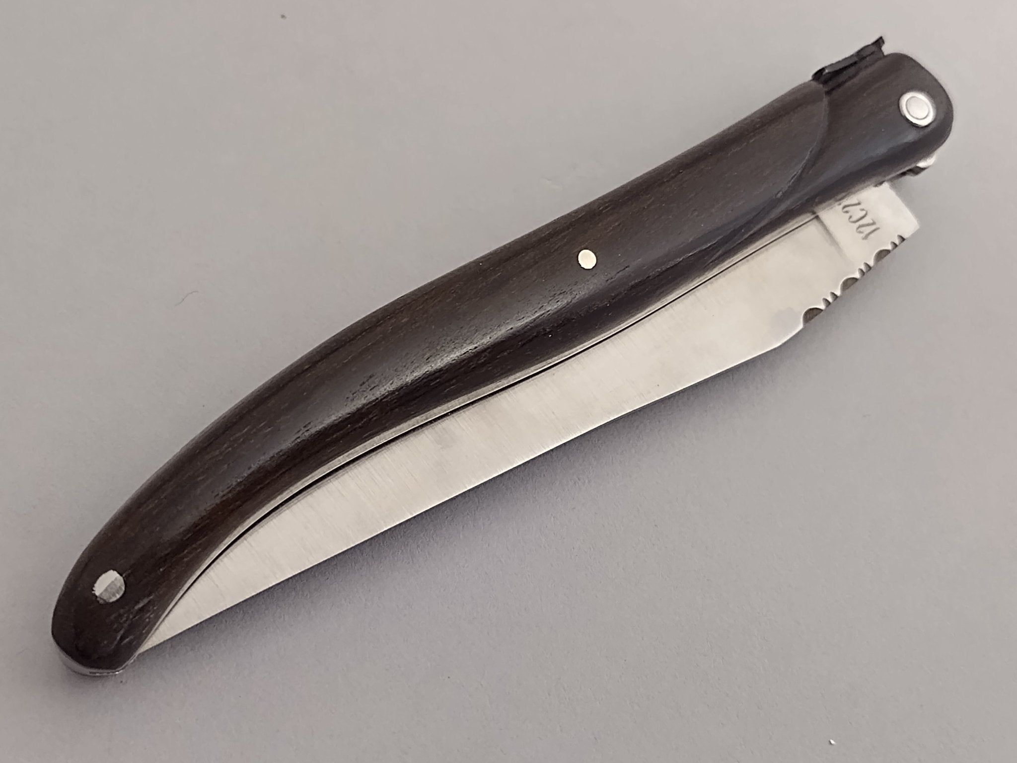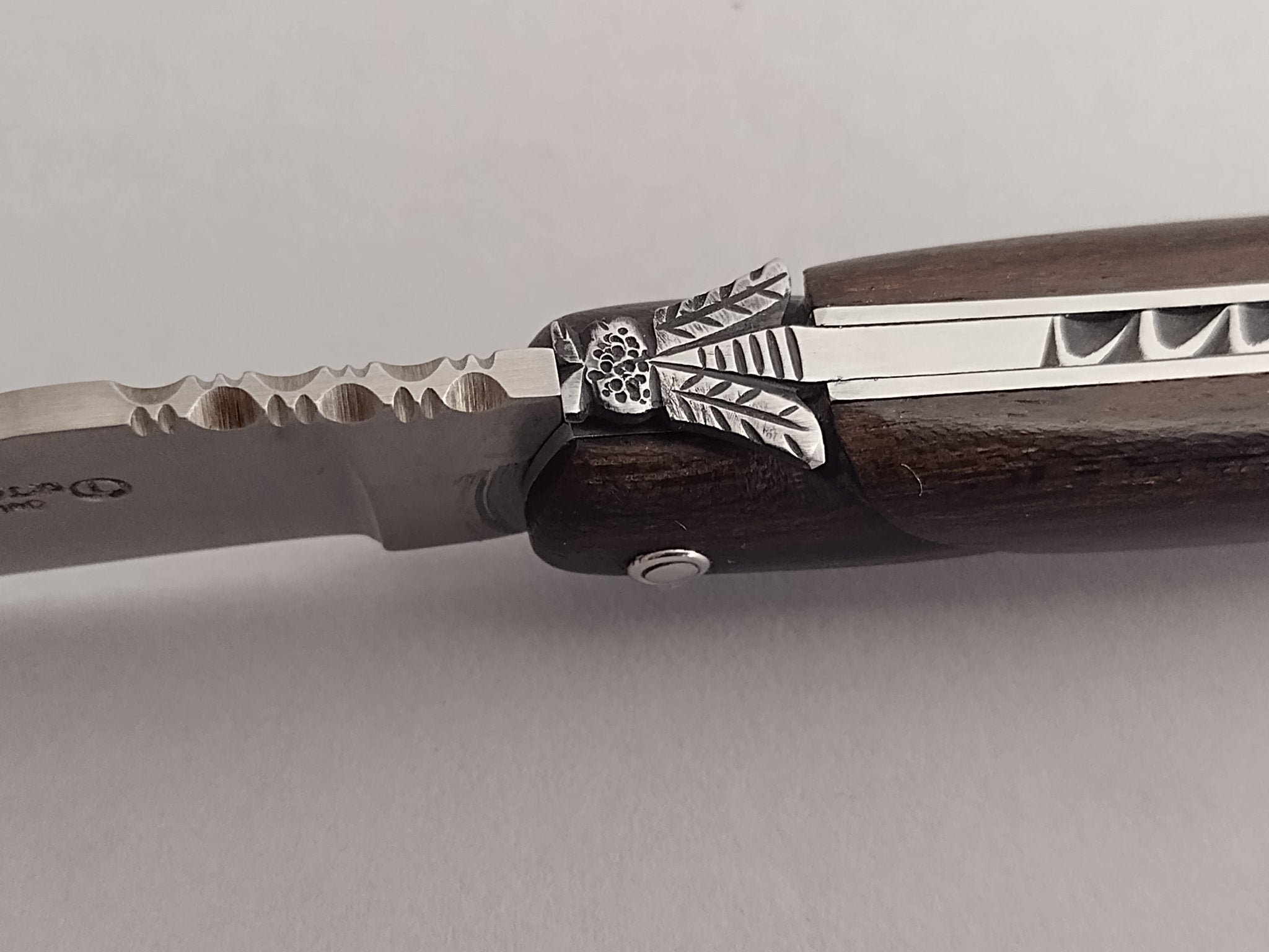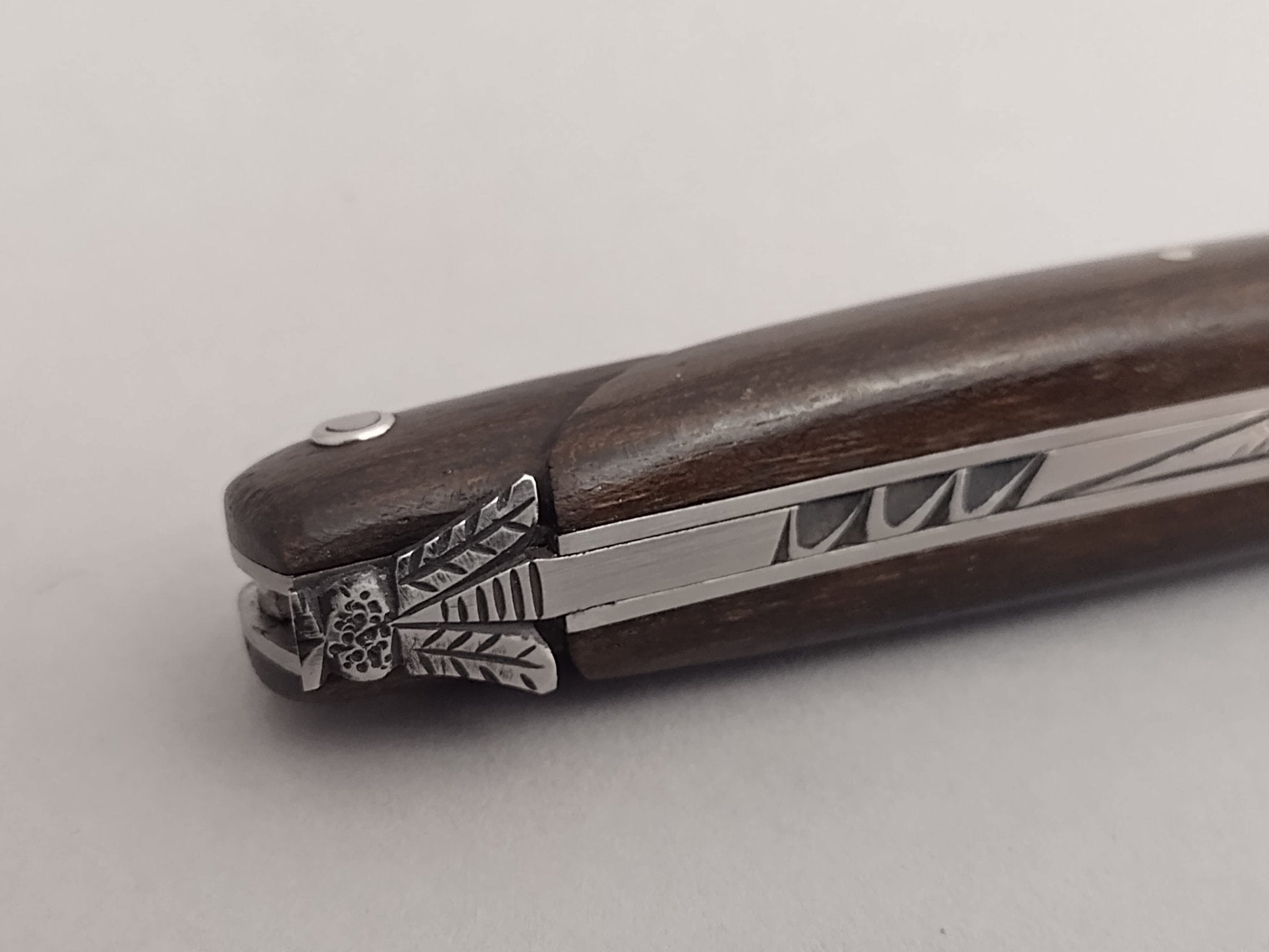 Zakmes, vervaardigd door Laguiole en Aubrac, met roestvrij stalen lemmet 12 cm met handgegraveerde bij met ziricote heft. Lengte met opengeklapt mes: 22 cm, met gesloten mes: 12 cm.