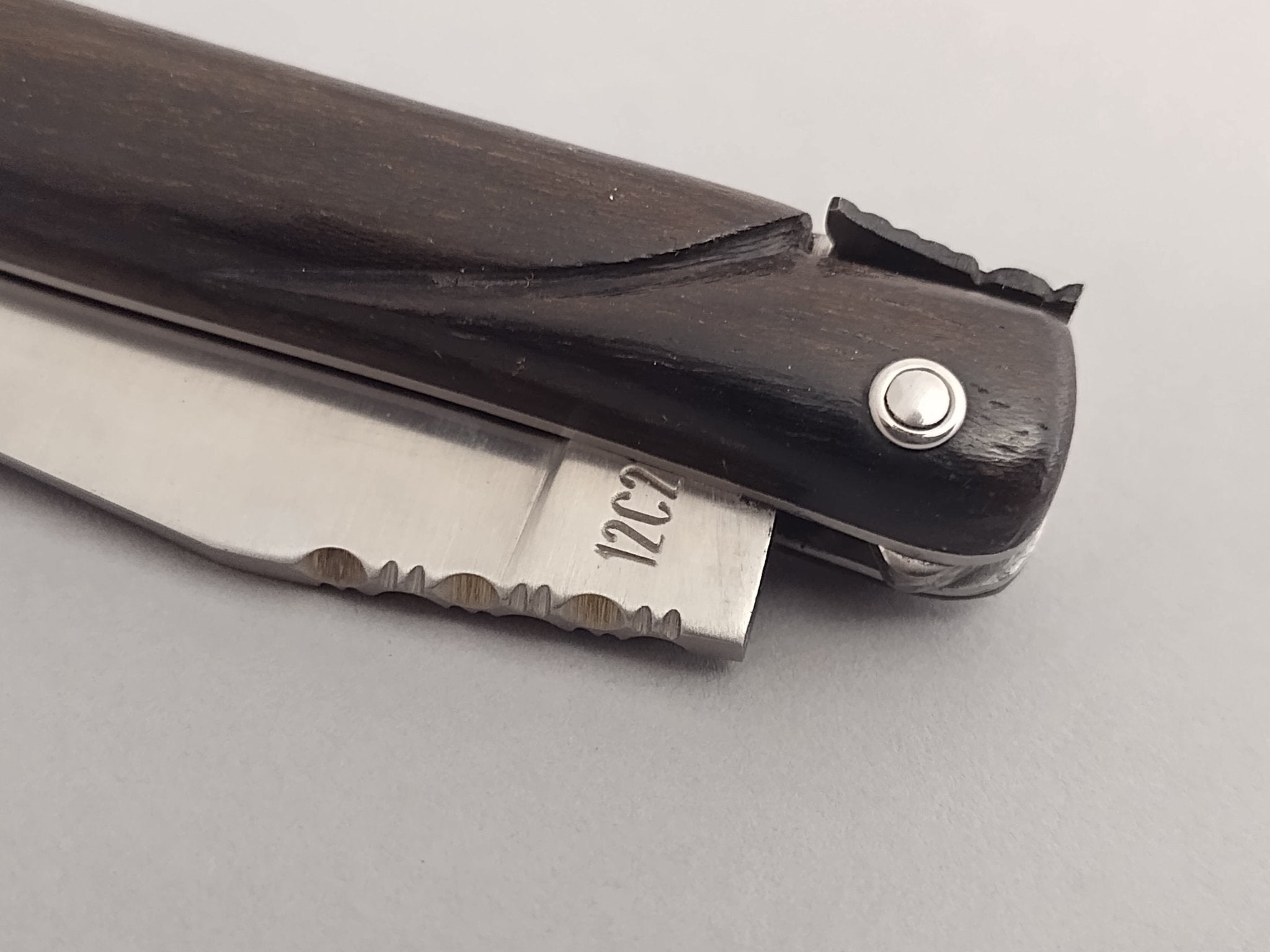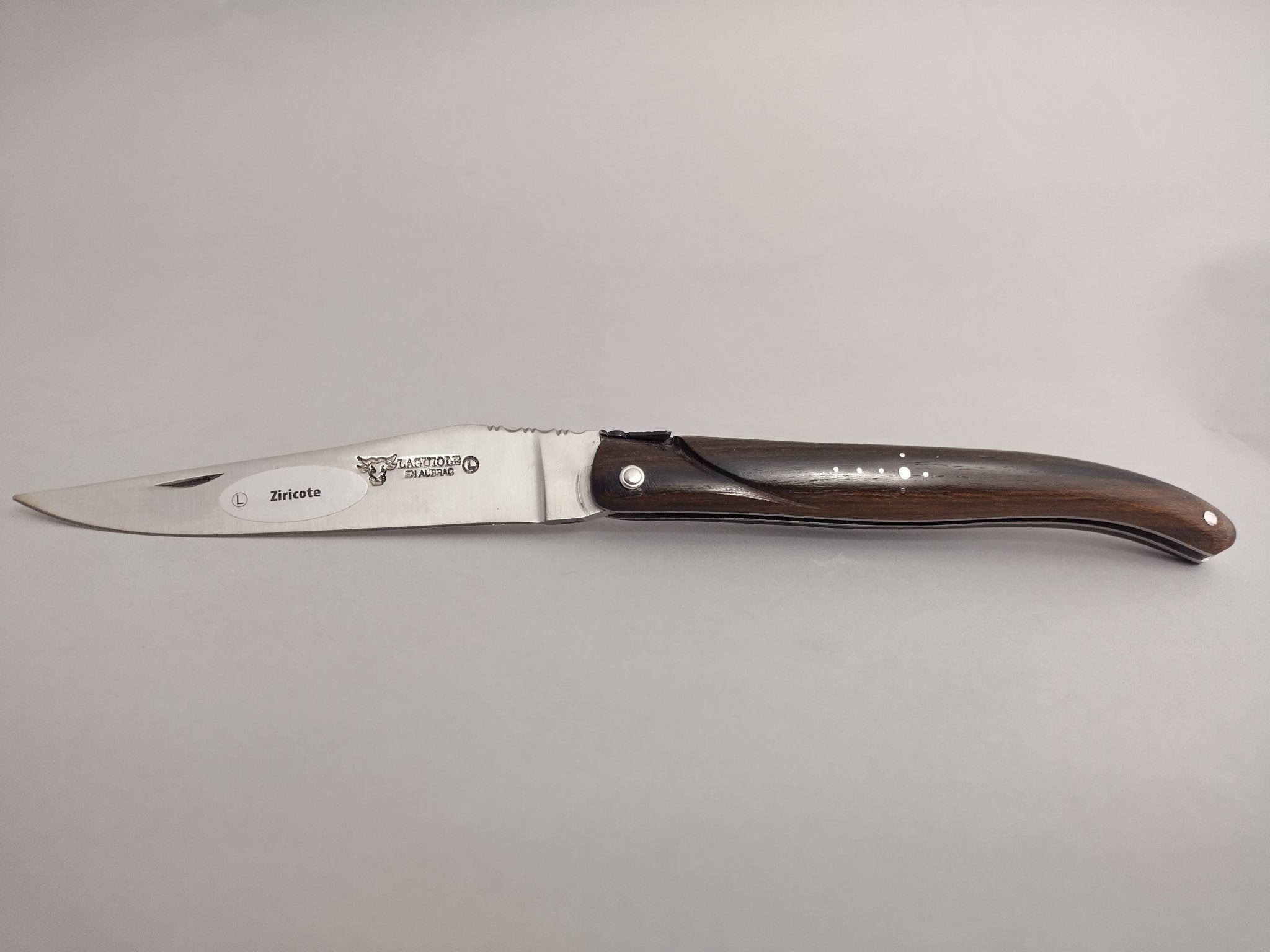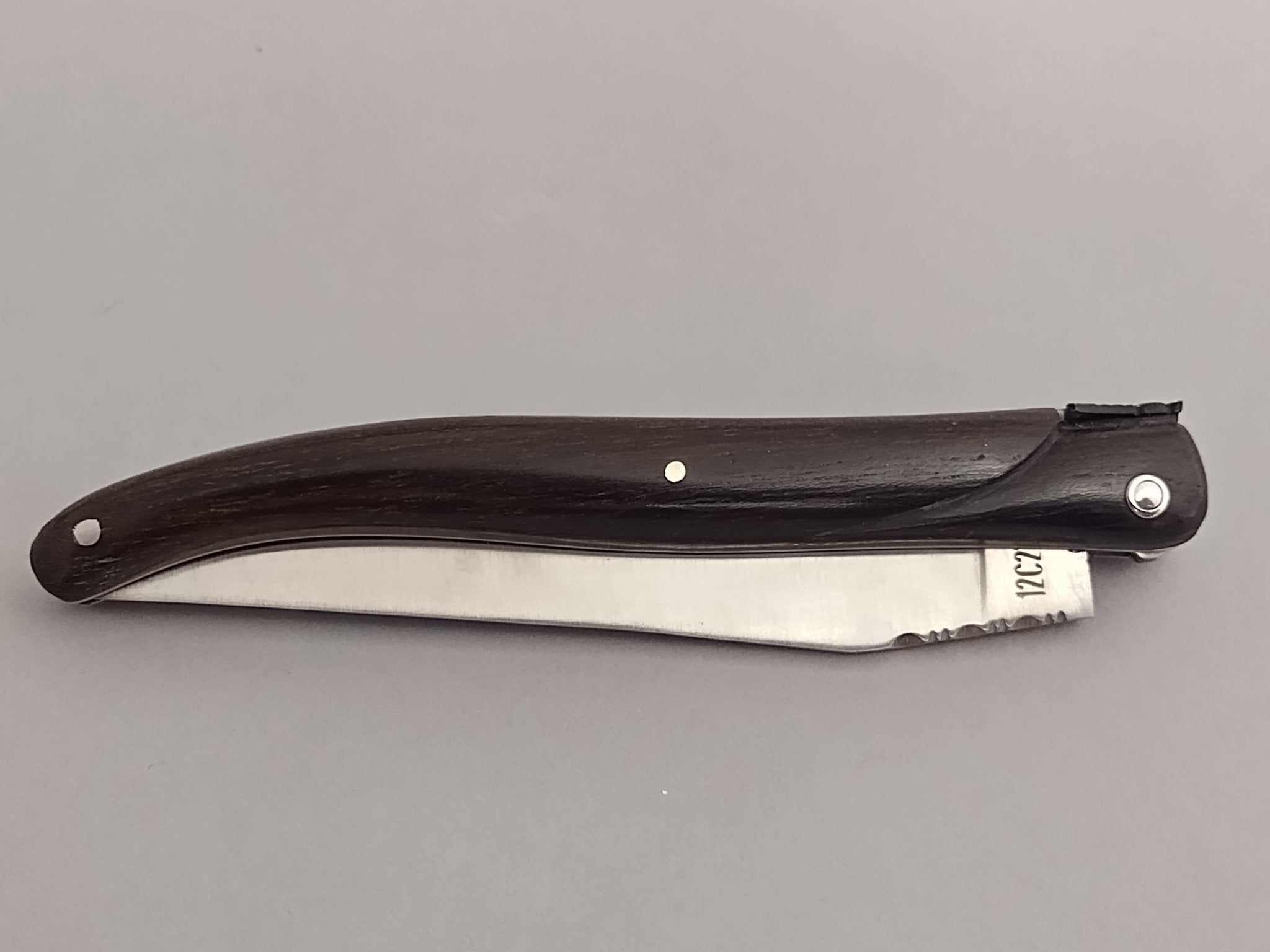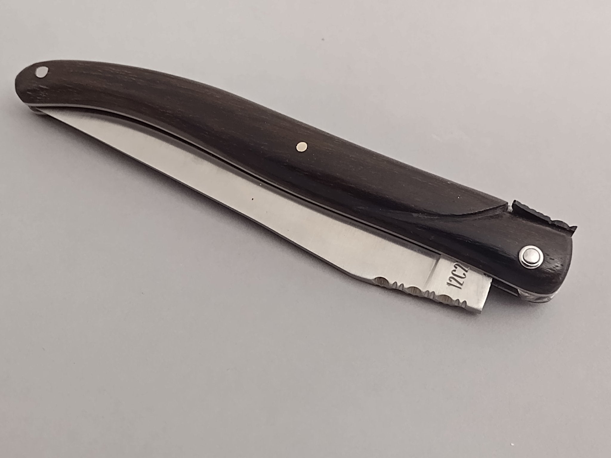 Zakmes, vervaardigd door Laguiole en Aubrac, met roestvrij stalen lemmet 12 cm met handgegraveerde bij met ziricote heft. Lengte met opengeklapt mes: 22 cm, met gesloten mes: 12 cm.