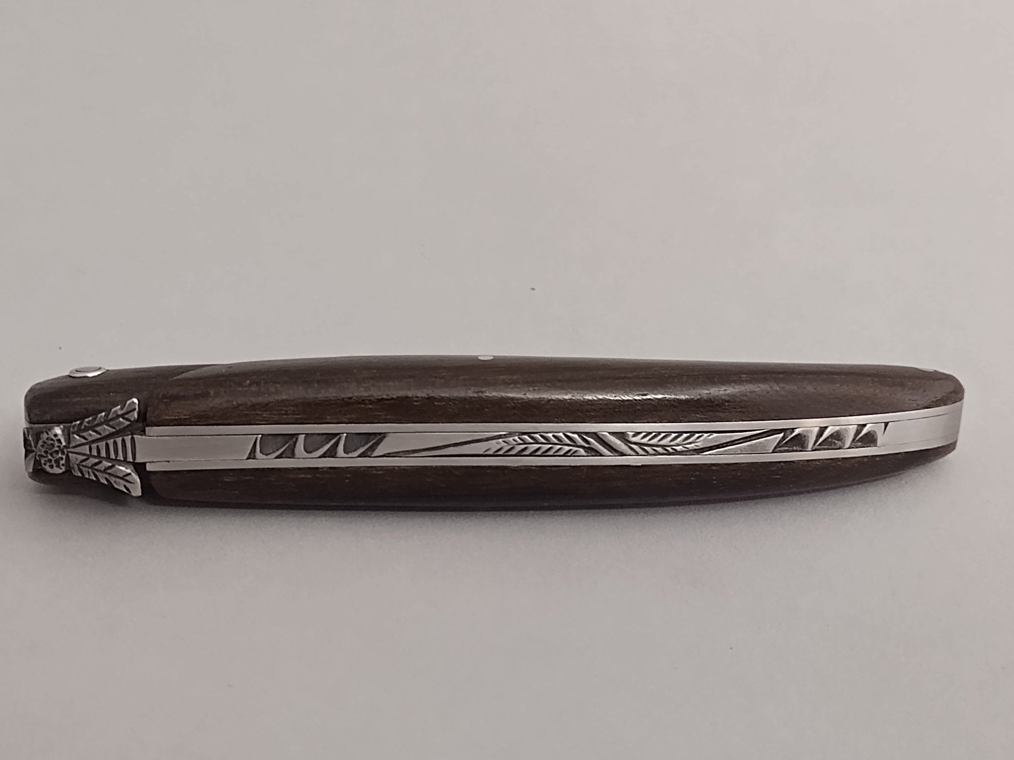 Zakmes, "l'élégant" 12 cm gesatineerd rvs met heft van ziricote, met handgegraveerde bij en veer.