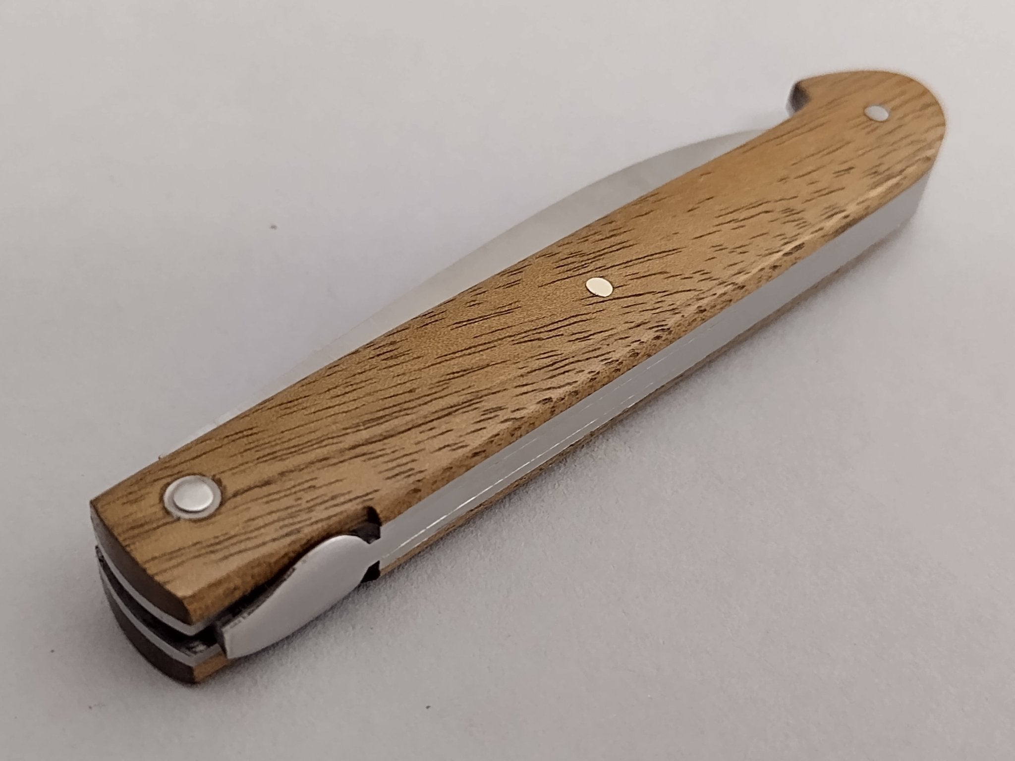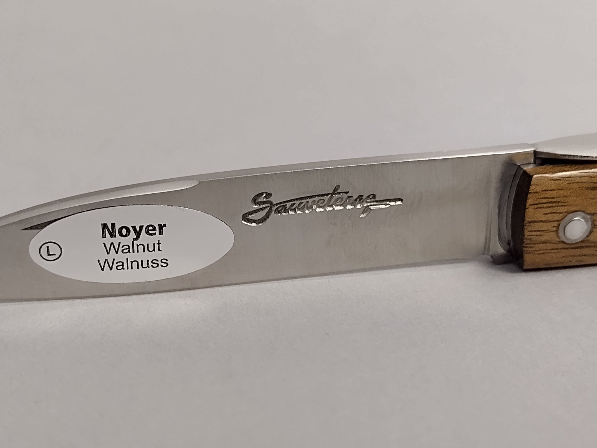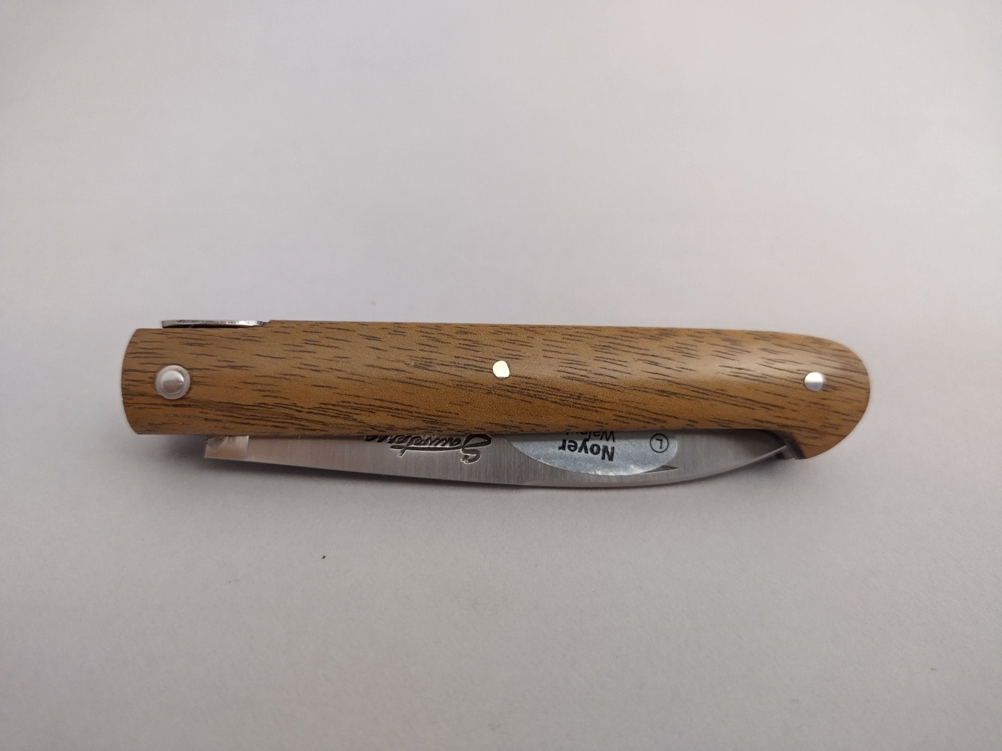 Zakmesje, vervaardigd door Sauveterre, met roestvrij stalen lemmet 9 cm met notenhouten heft.