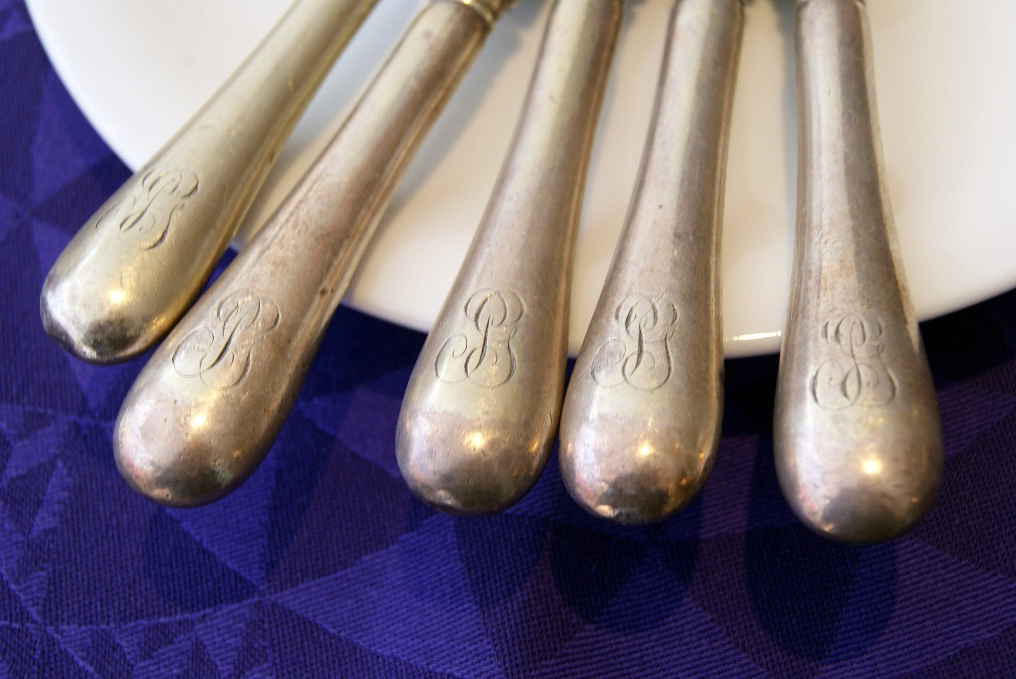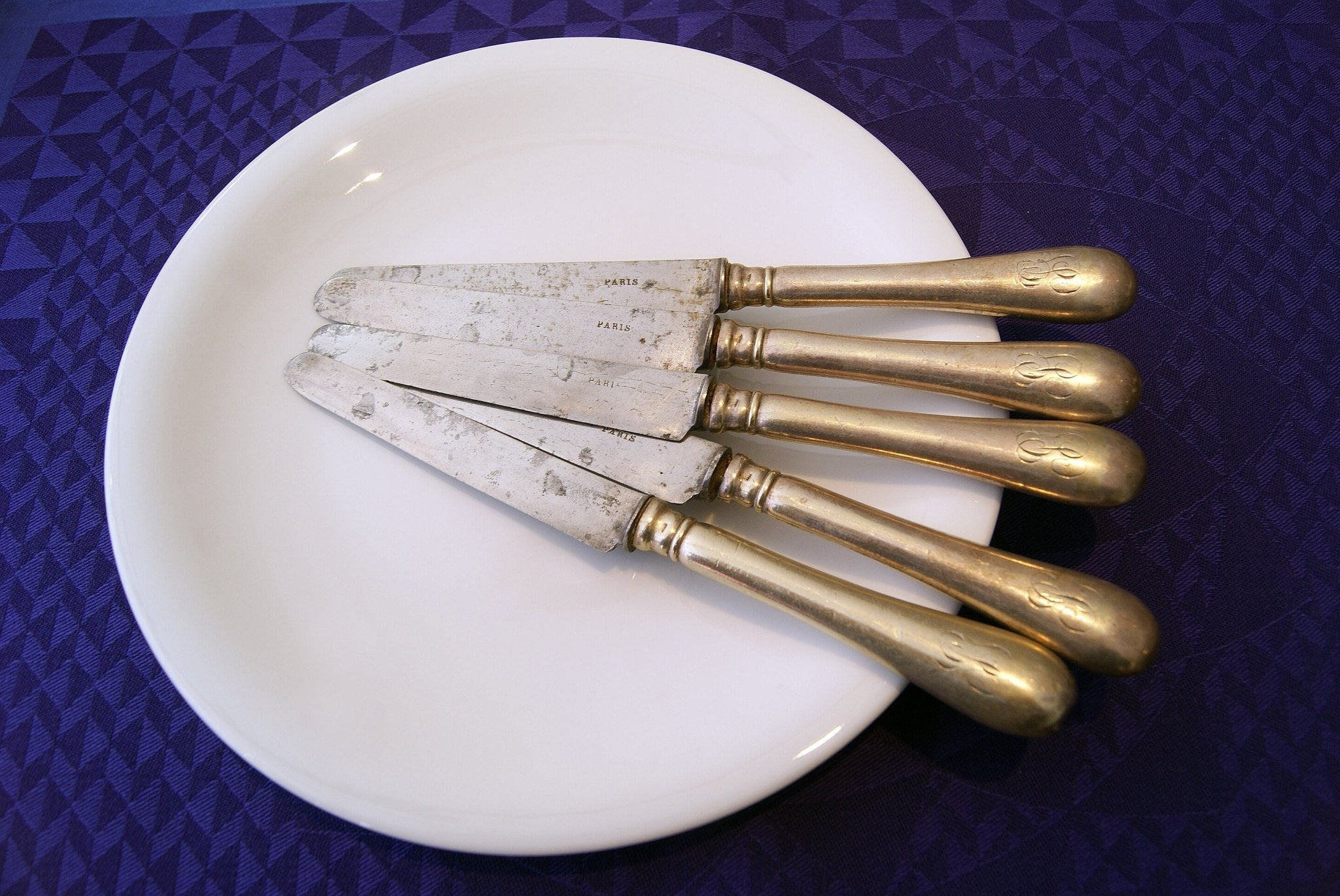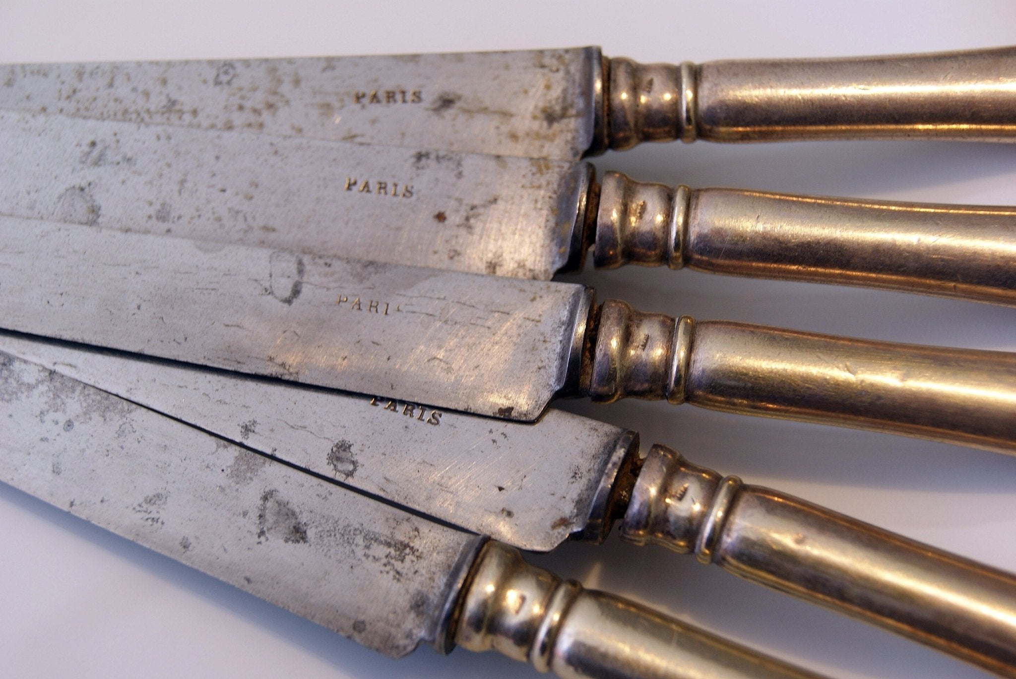 Een mes meet 20,5 cm, het lemmet is 10,3 mm. Ze zijn allemaal op het lemmet met “Paris” gegraveerd, de zilveren steel is gegraveerd met de initialen van een vroegere eigenaar. Te dateren in de tweede helft van de 19e eeuw.